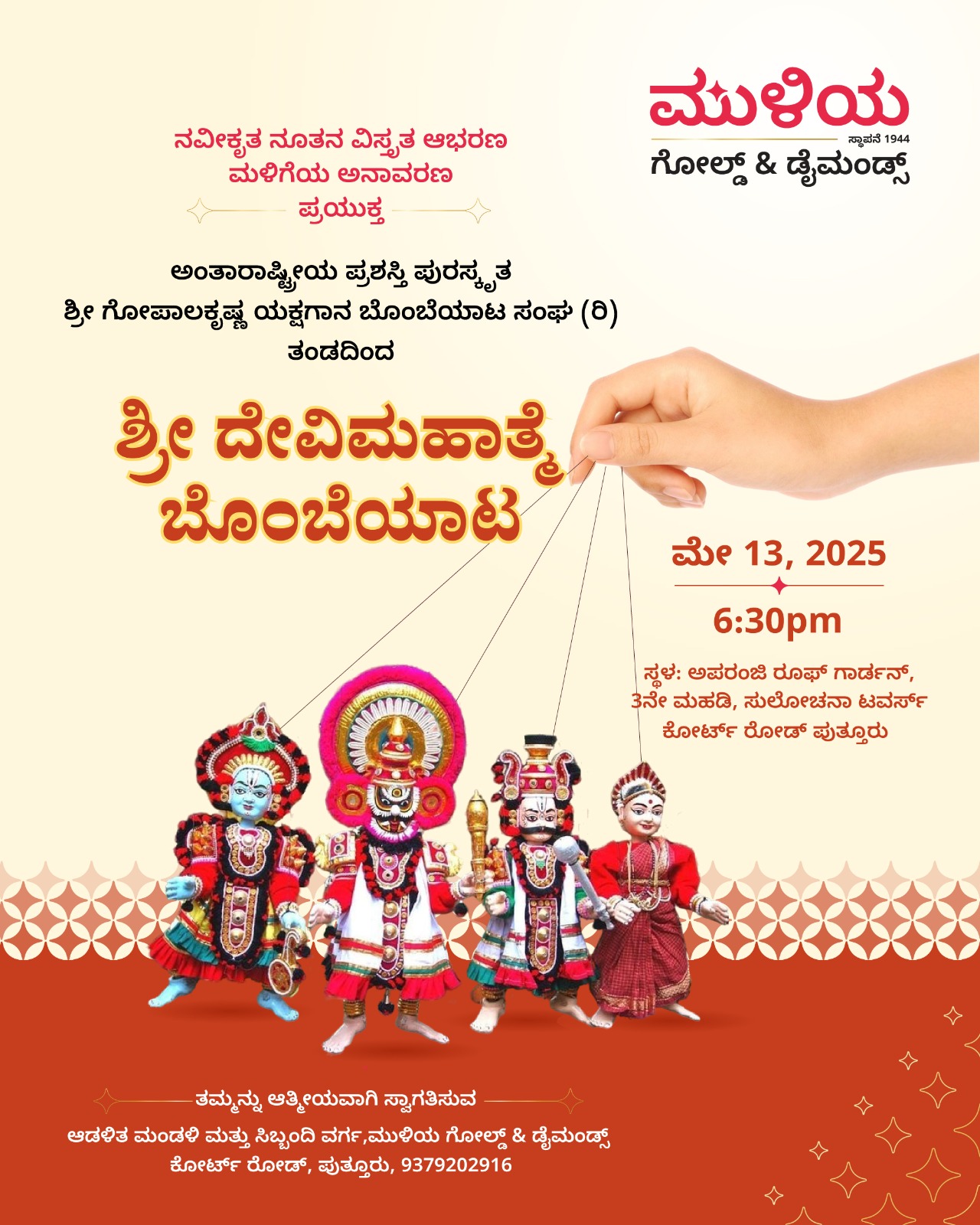 ಮುಳಿಯದ ಹೊಸ ವಿನೂತನ ಶೋರೂಮ್ ಉದ್ಘಾಟನಾ ಸಮಾರಂಭದ ಅಂಗವಾಗಿ ಕಾಸರಗೋಡಿನ ಗೋಪಾಲಕೃಷ್ಣ ಯಕ್ಷಗಾನ ಬೊಂಬೆಯಾಟ ಸಂಘ ಇವರಿಂದ ಮೇ 13 ರಂದು ಸಂಜೆ .6.30 ಕ್ಕೆ ಶ್ರೀದೇವಿ ಮಹಾತ್ಮೆ ಯಕ್ಷಗಾನ ಬೊಂಬೆಯಾಟ ನಡೆಯಲಿದೆ .