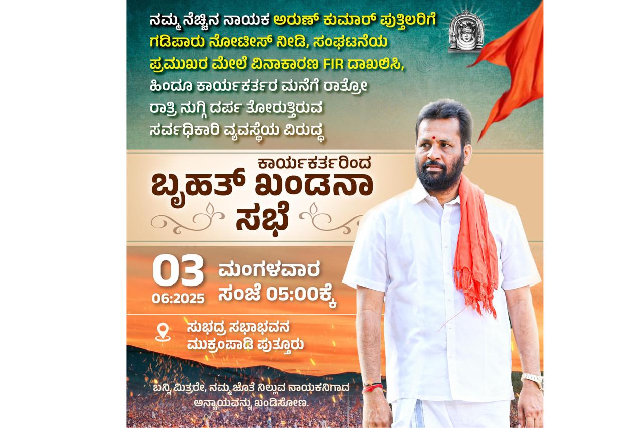 ಪುತ್ತೂರು: ಅರುಣ್ ಕುಮಾರ್ ಪುತ್ತಿಲ ಗಡಿಪಾರು ನೋಟಿಸ್ ನೀಡಿ , ಸಂಘಟನೆಯ ಪ್ರಮುಖರ ಮೇಲೆ ವಿನಾಕಾರಣ FIR ದಾಖಲಿಸಿದರ ವಿರುದ್ಧ ಕಾರ್ಯಕರ್ತರಿಂದ ಬೃಹತ್ ಖಂಡನಾ ಸಭೆ ಜೂ.03 ರಂದು ಸುಭದ್ರ ಸಭಾಭವನ ಮುಕ್ರಂಪಾಡಿ ಯಲ್ಲಿ ನಡೆಯಲಿದೆ.