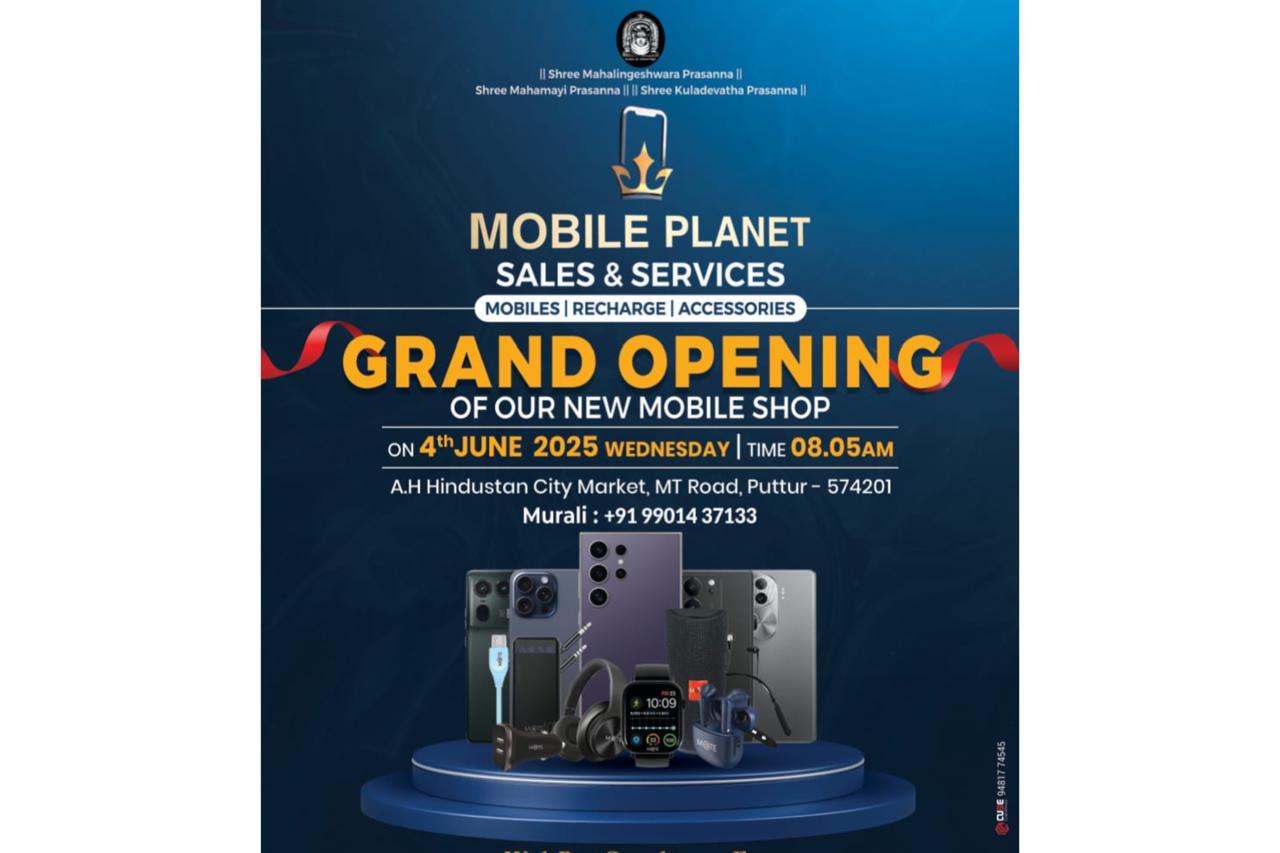 ಪುತ್ತೂರು: ಇಲ್ಲಿನ ಎ ಎಚ್ ಹಿಂದೂಸ್ಥಾನ್ ಸಿಟಿ ಮಾರ್ಕೆಟ್ ಎಂ ಟಿ ರೋಡ್ ನಲ್ಲಿ ನೂತನ ಮೊಬೈಲ್ ಮಳಿಗೆ ಮೊಬೈಲ್ ಪ್ಲಾನೆಟ್ ಸೇಲ್ಸ್ ಆಂಡ್ ಸರ್ವಿಸಸ್ ಶುಭಾರಂಭಗೊಳ್ಳಲಿದೆ.