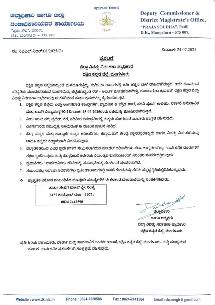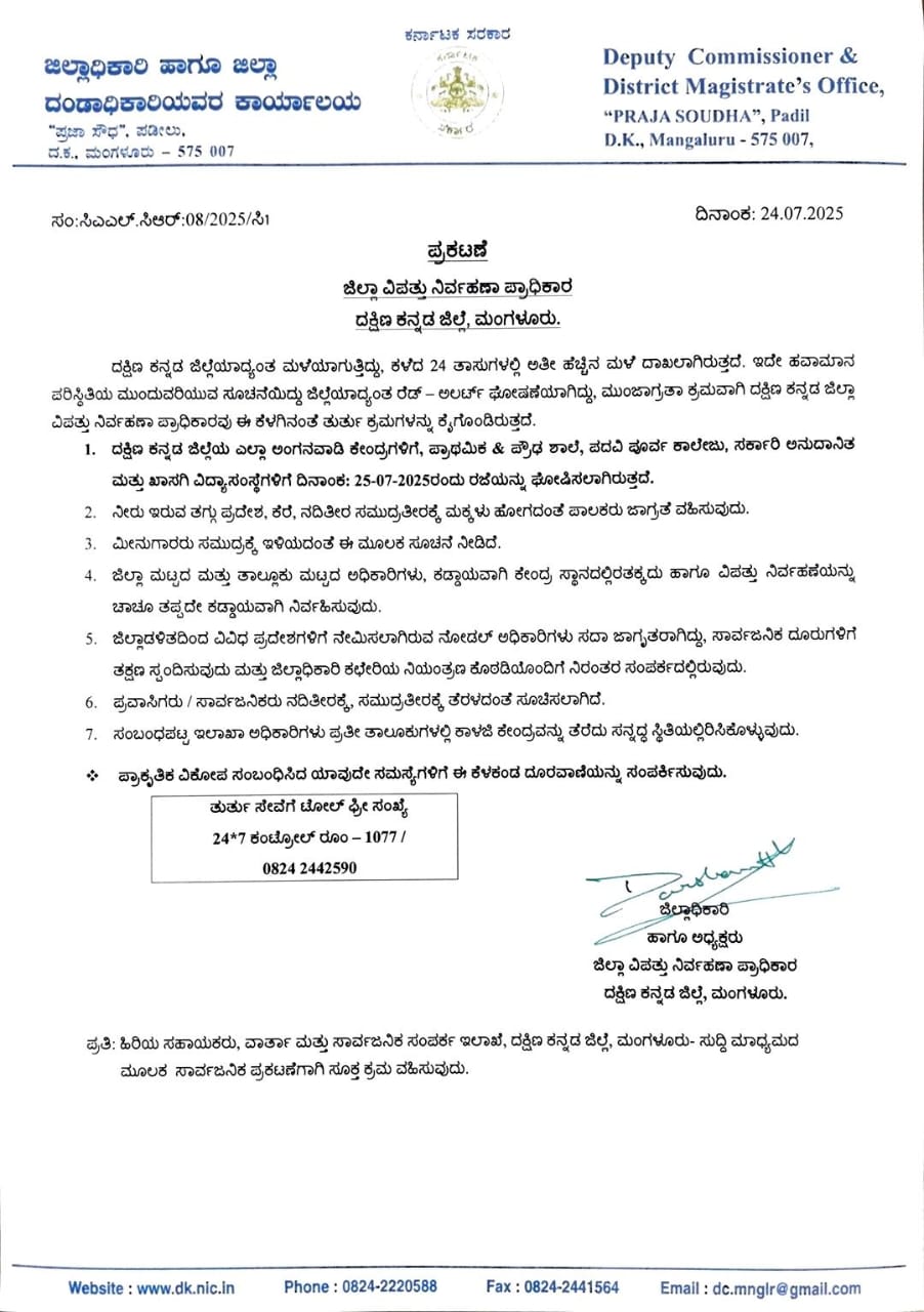 ಪುತ್ತೂರು: ದಿನವಿಡಿ ಭಾರೀ ಮಳೆ ಹಿನ್ನೆಲೆಯಲ್ಲಿ ದಕ್ಷಿಣ ಕನ್ನಡ ಜಿಲ್ಲೆಯ ಎಲ್ಲಾ ಅಂಗನವಾಡಿ, ಪ್ರಾಥಮಿಕ, ಪ್ರೌಢ ಶಾಲೆಗಳಿಗೆ ಮತ್ತು ಜು.25 ರಂದು ರಜೆ ಘೋಷಿಸಲಾಗಿದೆ.