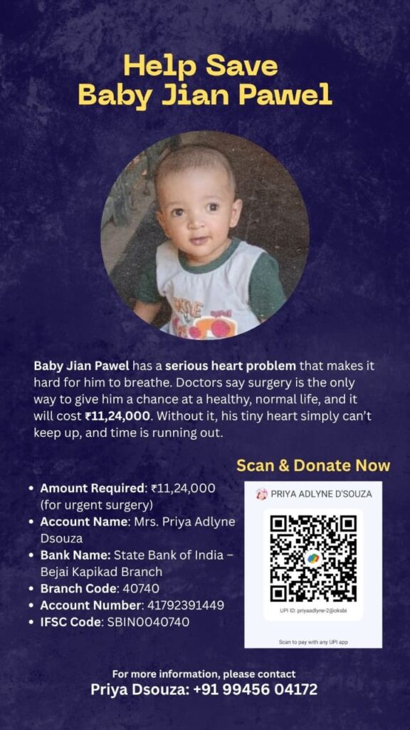 ಮಂಗಳೂರು: ಪ್ರಿಯಾ ಅಡ್ಲಿನ್ ಡಿಸೋಜ ಎಂಬುವರ 1 ವರ್ಷ 4 ತಿಂಗಳು ಪ್ರಾಯದ ಮಗು ಜಿಯಾನ್ ಪಾವೆಲ್ ಗಂಭೀರ ಹೃದಯ ಸಮಸ್ಯೆಯಿಂದ ಬಳಲುತ್ತಿದ್ದು ಉಸಿರಾಡಲೂ ಕಷ್ಟಪಡುತ್ತಿದ್ದಾನೆ. ಮಗುವನ್ನು ಉಳಿಸಿಕೊಳ್ಳಲು ಶಸ್ತ್ರಚಿಕಿತ್ಸೆಯೊಂದೇ ಮಾರ್ಗವಾಗಿದ್ದು 11,24,000 ರೂ. ವೆಚ್ಚವಾಗುತ್ತದೆ ಎಂದು ವೈದ್ಯರು ತಿಳಿಸಿದ್ದಾರೆ. ಪಾಲಕರು ಈಗಾಗಲೇ ತಮ್ಮ ಸಾಮರ್ಥ್ಯ ಮೀರಿ ಖರ್ಚು ಮಾಡಿದ್ದು ಇನ್ನು ಮುಂದಿನ ಖರ್ಚಿಗಾಗಿ ದಾನಿಗಳ ನೆರವು ಯಾಚಿಸಿದ್ದಾರೆ. ಸಹಾಯ ಮಾಡುವವರು ಈ ಖಾತೆಗೆ ಜಮೆ ಮಾಡಬಹುದು. ಖಾತೆಯ ಹೆಸರು: ಪ್ರಿಯಾ ಅಡ್ಲಿನ್ ಡಿಸೋಜ, ಬ್ಯಾಂಕ್ ಹೆಸರು: ಸ್ಟೇಟ್ ಬ್ಯಾಂಕ್ ಆಫ್ ಇಂಡಿಯಾ ಬಿಜೈ, ಕಾಪಿಕಾಡ್ ಶಾಖೆ, ಶಾಖಾ ಕೋಡ್: 40740, ಖಾತೆ ಸಂಖ್ಯೆ: 41792391449, ಐಎಫ್ಎಸ್ಸಿ ಕೋಡ್: SBIN 0040740.