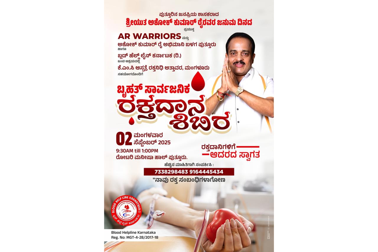 ಪುತ್ತೂರು: ಶಾಸಕ ಅಶೋಕ್ ಕುಮಾರ್ ರೈ ಹುಟ್ಟುಹಬ್ಬದ ಪ್ರಯುಕ್ತ A R ವಾರಿಯರ್ಸ್ ಮತ್ತು ಅಶೋಕ್ ಕುಮಾರ್ ರೈ ಅಭಿಮಾನಿ ಬಳಗ ಪುತ್ತೂರು ಹಾಗೂ ಬ್ಲಡ್ ಹೆಲ್ಪ್ ಲೈನ್ ಕರ್ನಾಟಕ (ರಿ.) ಇದರ ಜಂಟಿ ಆಶ್ರಯದಲ್ಲಿ ಕೆ ಎಂ ಸಿ ಆಸ್ಪತ್ರೆ ರಕ್ತನಿಧಿ ಅತ್ತಾವರ ಮಂಗಳೂರು ಸಹಯೋಗದೊಂದಿಗೆ ಬೃಹತ್ ಸಾರ್ವಜನಿಕ ರಕ್ತದಾನ ಶಿಬಿರ ಸೆ.02 ರಂದು ರೋಟರಿ ಮನೀಷಾ ಹಾಲ್ ನಲ್ಲಿ ಬೆಳಗ್ಗೆ 9.30 ರಿಂದ ಮಧ್ಯಾಹ್ನ 1 ಗಂಟೆಯ ವರೆಗೆ ನಡೆಯಲಿದೆ.