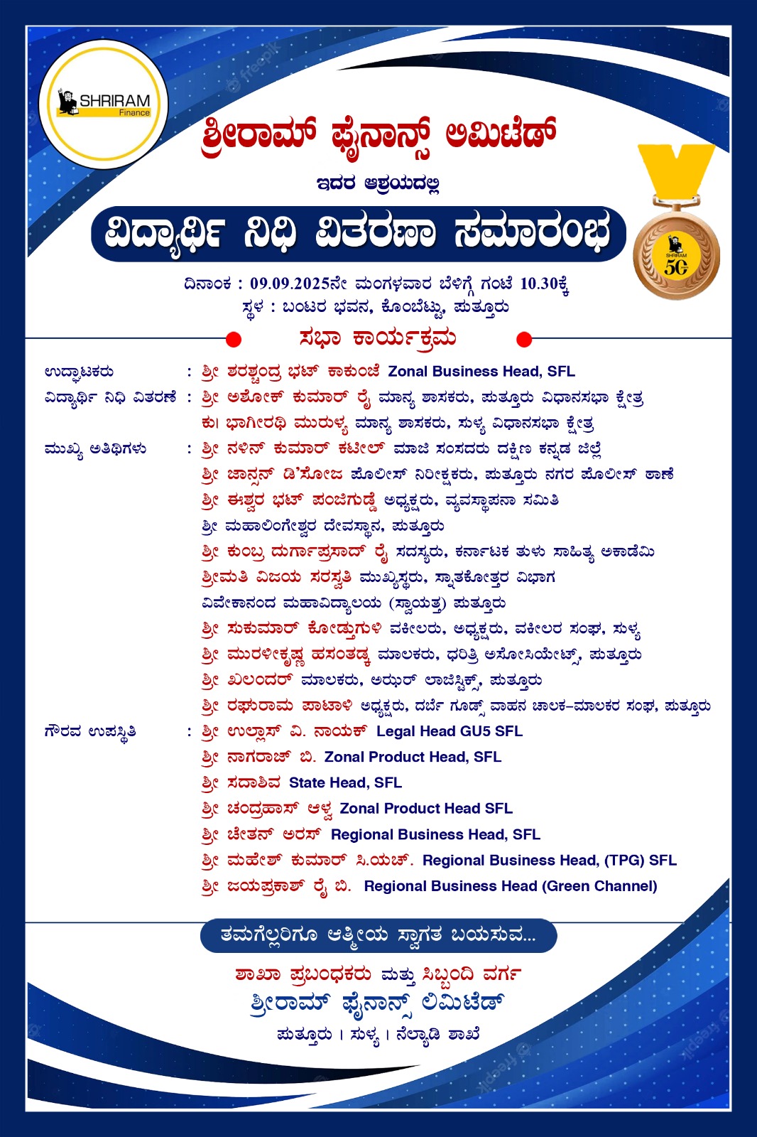 ಪುತ್ತೂರು: ಶ್ರೀರಾಮ್ ಫೈನಾನ್ಸ್ ಲಿಮಿಟೆಡ್ ಇದರ ಆಶ್ರಯದಲ್ಲಿ ವಿದ್ಯಾರ್ಥಿ ನಿಧಿ ವಿತರಣಾ ಸಮಾರಂಭ ಸೆ.09 ರಂದು ಪುತ್ತೂರಿನ ಕೊಂಬೆಟ್ಟಿನ ಬಂಟರ ಭವನದಲ್ಲಿ ನಡೆಯಲಿದೆ.