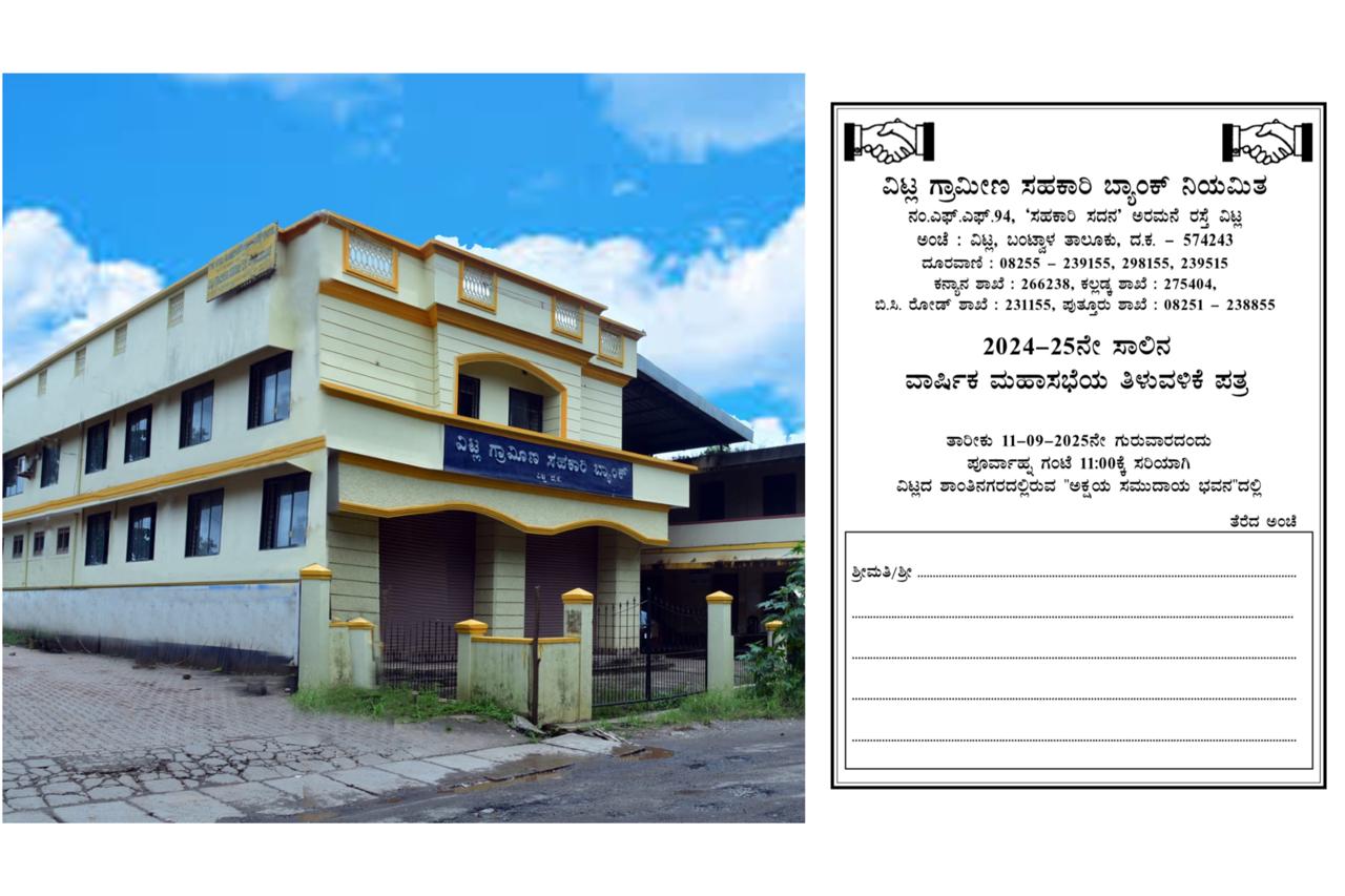 ವಿಟ್ಲ: ವಿಟ್ಲ ಗ್ರಾಮೀಣ ಸಹಕಾರಿ ಬ್ಯಾಂಕ್ (ನಿ.) ಇದರ 2024-2025ನೇ ಸಾಲಿನ ವಾರ್ಷಿಕ ಮಹಾಸಭೆಯು ಸೆ.11 ರಂದು ವಿಟ್ಲದ ಶಾಂತಿನಗರದಲ್ಲಿರುವ ಅಕ್ಷಯ ಸಭಾಭವನದಲ್ಲಿ ಬ್ಯಾಂಕ್ ನ ಅಧ್ಯಕ್ಷ ಯಚ್ ಜಗನ್ನಾಥ್ ಸಾಲಿಯಾನ್ ರವರ ಅಧ್ಯಕ್ಷತೆಯಲ್ಲಿ ನಡೆಯಲಿದೆ.