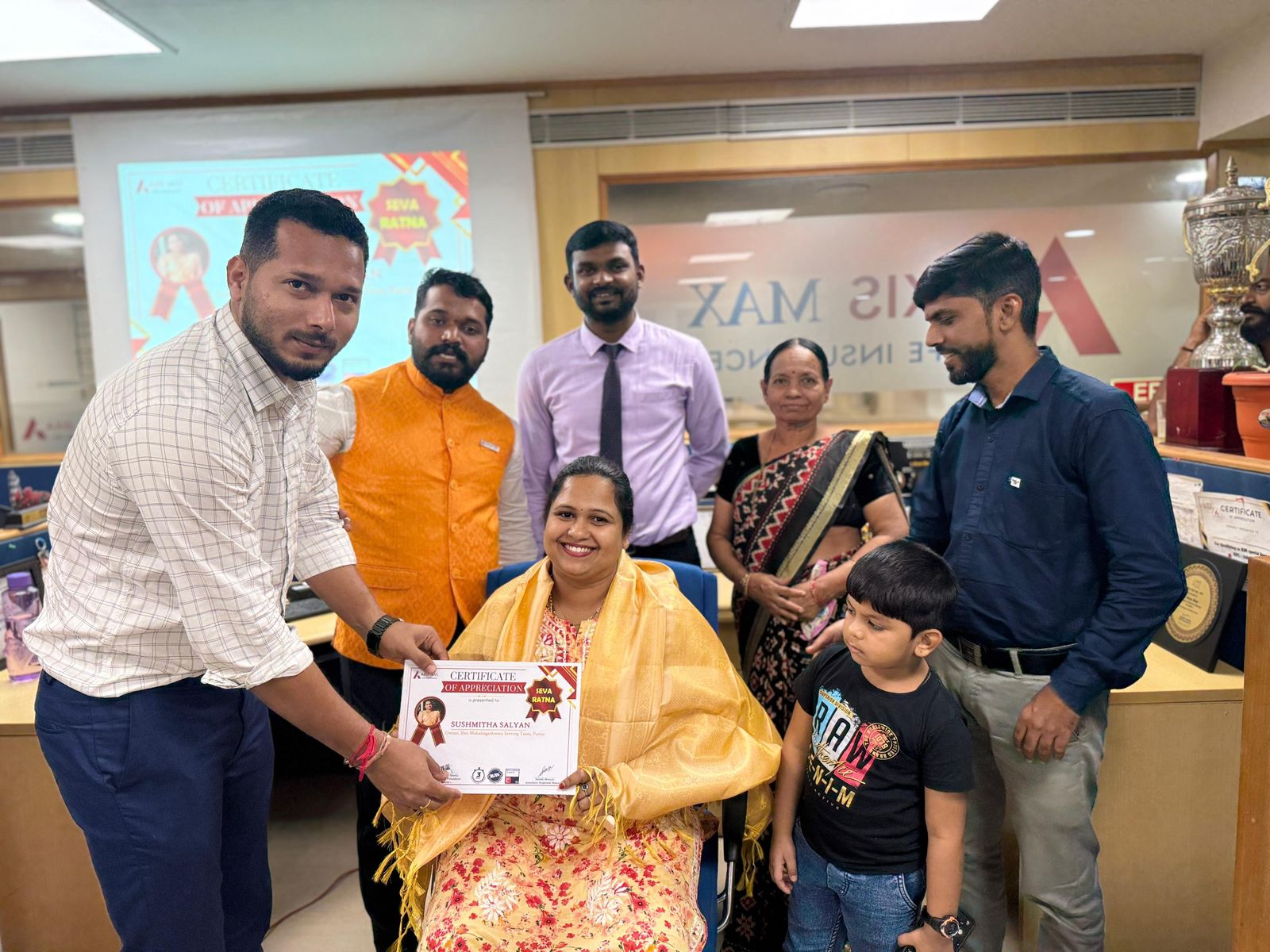 ಮಂಗಳೂರಿನ ಅತ್ತಾವರದಲ್ಲಿರುವ Axis Max ltd insurance ನ ಕೇಂದ್ರ ಕಚೇರಿಯಲ್ಲಿ ಶ್ರೀ ಮಹಾಲಿಂಗೇಶ್ವರ ಸರ್ವಿಂಗ್ ಟೀಮ್ ಪುತ್ತೂರು ಇದರ ಮುಖ್ಯಸ್ಥರಾದ ಸುಶ್ಮಿತಾ ಸಾಲ್ಯಾನ್ ರವರಿಗೆ ಮಹಿಳೆಯರಿಗೆ ಆರ್ಥಿಕವಾಗಿ ಸ್ವಾವಲಂಬನೆಯ ಜೀವನ ನಡೆಸಲು ಪ್ರೋತ್ಸಾಹಿಸಿದ್ದಕ್ಕೆ ಜಿಲ್ಲಾ ಮಟ್ಟದ ಸೇವಾರತ್ನ ಪ್ರಶಸ್ತಿಯನ್ನು Axis Bank Max Life Insurance ನ ಸಹಭಾಗಿತ್ವದಲ್ಲಿ ನಡೆದ ಕಾರ್ಯಕ್ರಮದಲ್ಲಿ ಸಂಸ್ಥೆಯ ಪ್ರಮುಖರು ಮತ್ತು ಸಿಬ್ಬಂಧಿ ವರ್ಗ ಪ್ರಶಸ್ತಿ ಪ್ರದಾನ ಮಾಡಿದರು.