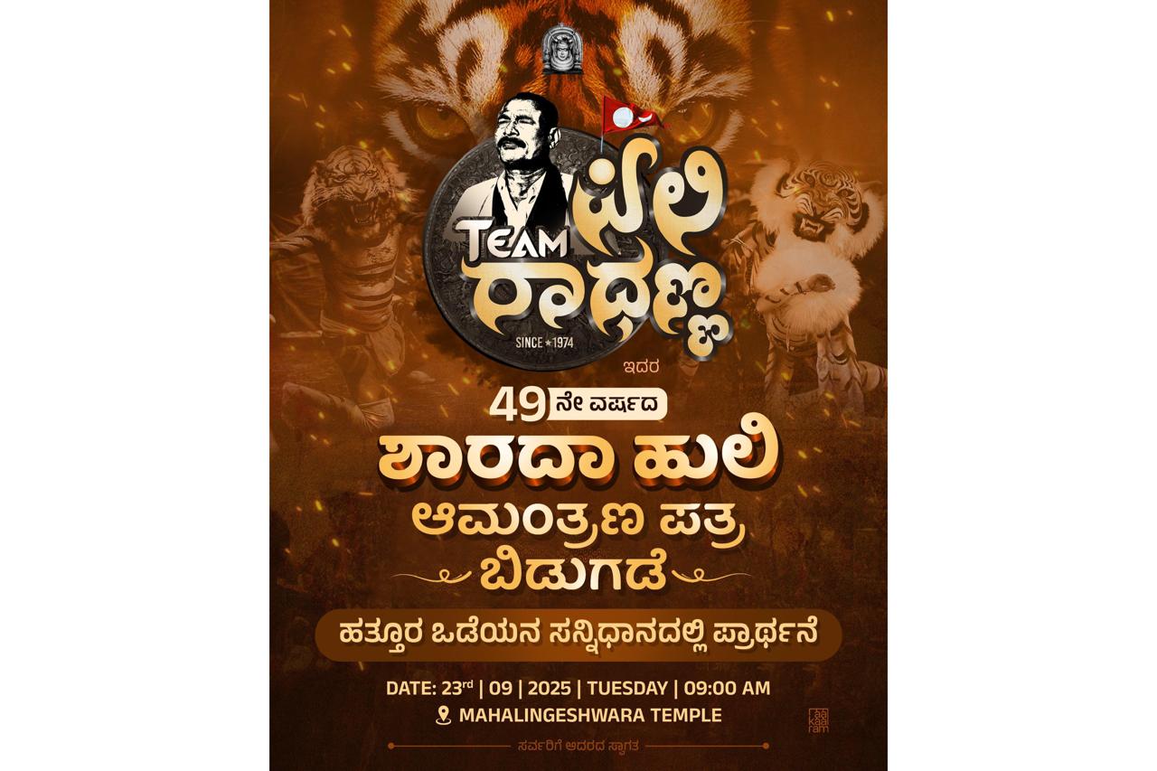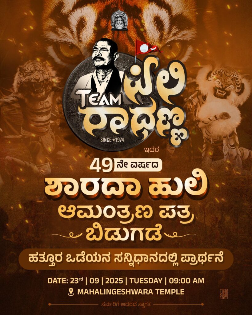 ಪುತ್ತೂರು: ಟೀಮ್ ಪಿಲಿ ರಾಧಣ್ಣ ಇದರ 49 ನೇ ವರ್ಷದ ಶಾರದಾ ಹುಲಿಯ ಆಮಂತ್ರಣ ಪತ್ರಿಕೆ ಬಿಡುಗಡೆ ಸೆ.23 ರಂದು ಪುತ್ತೂರು ಮಹಾಲಿಂಗೇಶ್ವರ ದೇವಸ್ಥಾನದಲ್ಲಿ ಬೆಳಗ್ಗೆ 9 ಗಂಟೆಗೆ ನಡೆಯಲಿದೆ ಎಂದು ಸಂಘಟಕರು ತಿಳಿಸಿದ್ದಾರೆ.