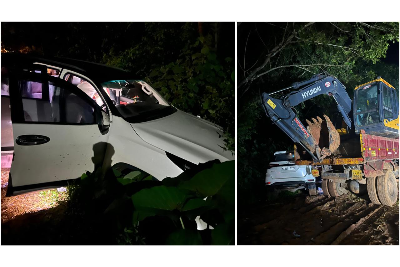 ಘಟನೆ ಪರಿಣಾಮ ಕಾರಿಗೆ ಹಾನಿಯಾಗಿದೆ. ಚಾಲಕ ಮತ್ತು ಪ್ರಯಾಣಿಕರು ಅಪಾಯದಿಂದ ಪಾರಾಗಿದ್ದಾರೆ ಎಂದು ತಿಳಿದು ಬಂದಿದೆ.