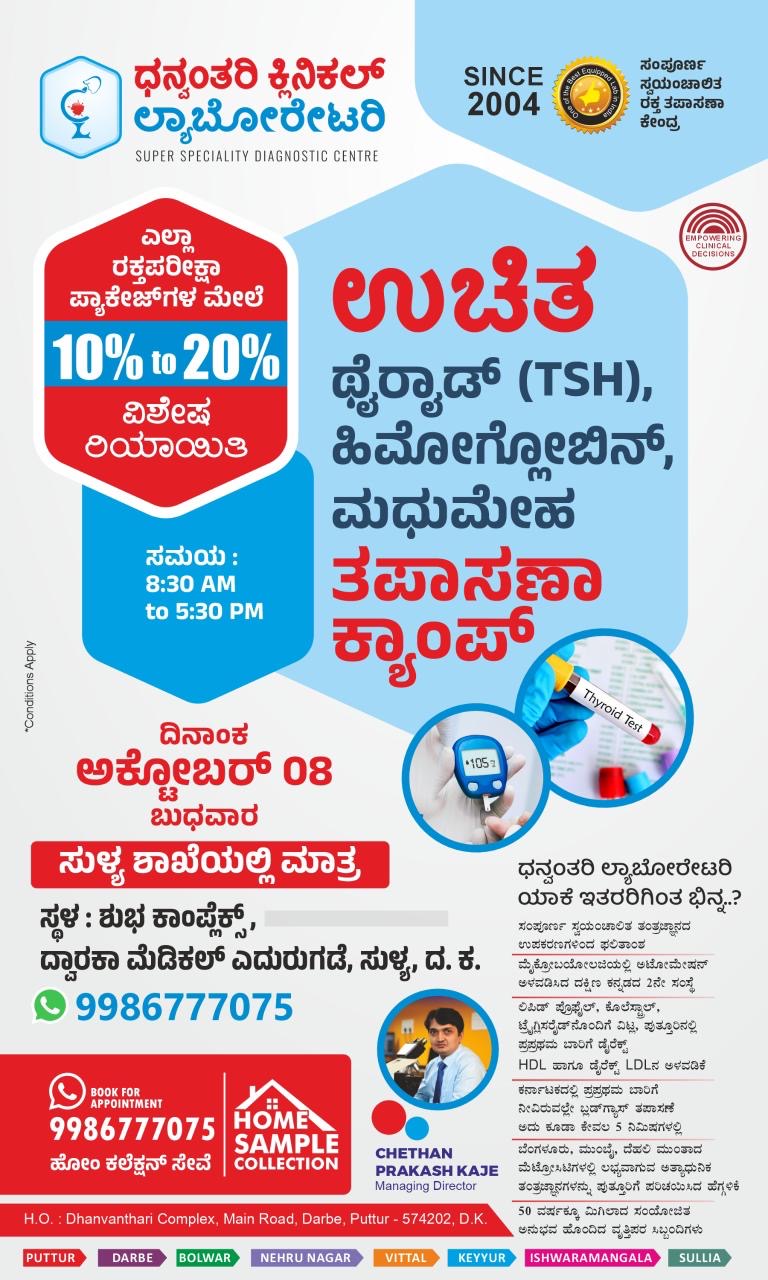 ಧನ್ವಂತರಿ ಕ್ಲಿನಿಕಲ್ ಲ್ಯಾಬೋರೇಟರಿಯಲ್ಲಿ ಉಚಿತ ಥೈರಾಯ್ಡ್, ಹಿಮೋಗ್ಲೋಬಿನ್, ಮಧುಮೇಹ ತಪಾಸಣಾ ಕ್ಯಾಂಪ್ ಅ.8 ಬುಧವಾರದಂದು ಸುಳ್ಯದ ದ್ವಾರಕಾ ಮೆಡಿಕಲ್ ಎದುರುಗಡೆಯ ಶುಭ ಕಾಂಪ್ಲೆಕ್ಸ್ ನಲ್ಲಿ ನಡೆಯಲಿದೆ.