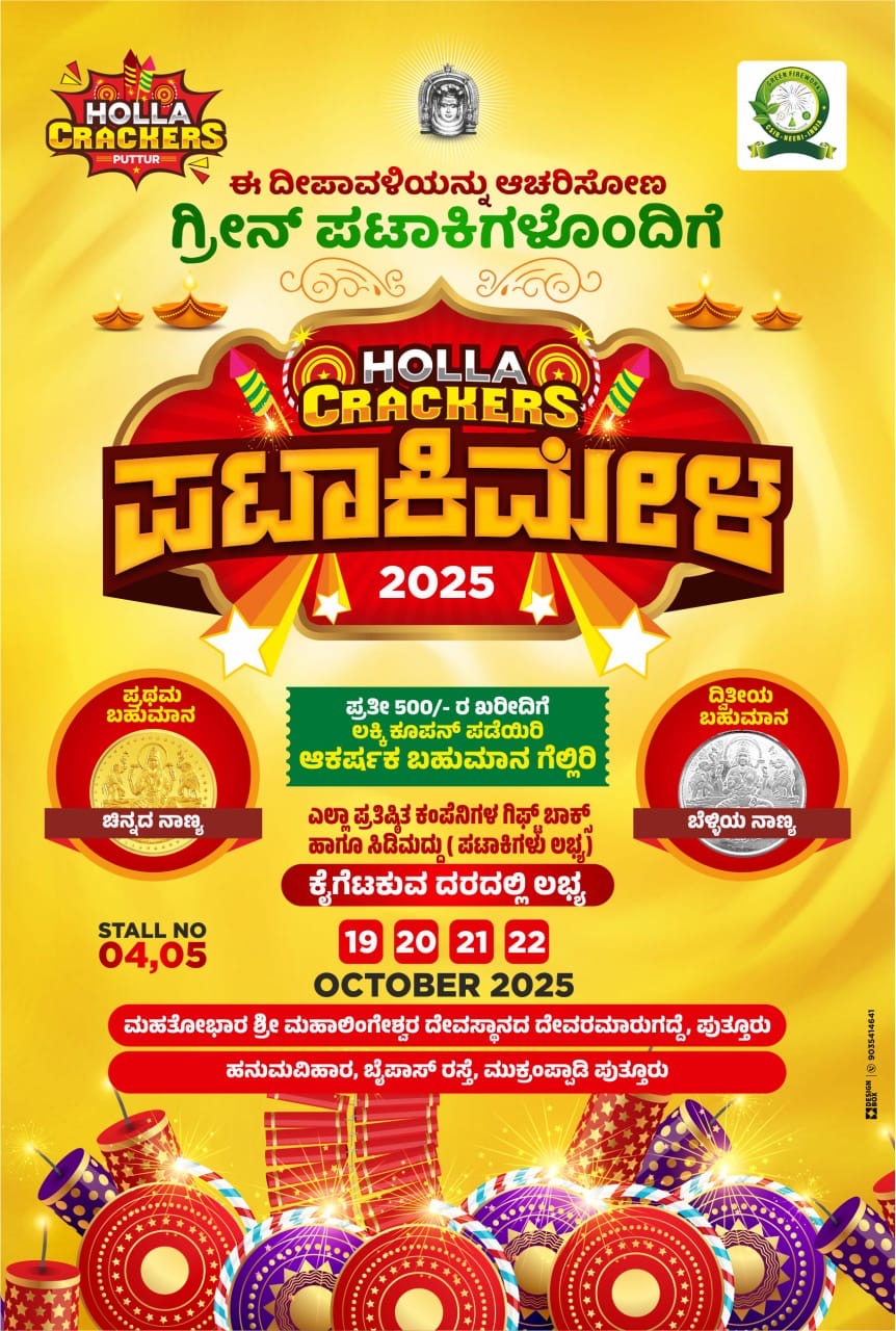 ಪುತ್ತೂರು:ಅ.19 ರಿಂದ 22 ರ ವರೆಗೆ ಹೊಳ್ಳ ಕ್ರಾಕರ್ಸ್ ಪಟಾಕಿ ಮೇಳ ಶ್ರೀ ಮಹಾಲಿಂಗೇಶ್ವರ ದೇವಸ್ಥಾನದ ದೇವರಮಾರು ಗದ್ದೆಯಲ್ಲಿ ಮತ್ತು ಮುಕ್ರಂಪಾಡಿ ಬೈಪಾಸ್ ರಸ್ತೆಯ ಹನುಮವಿಹಾರದಲ್ಲಿ ನಡೆಯಲಿದೆ.