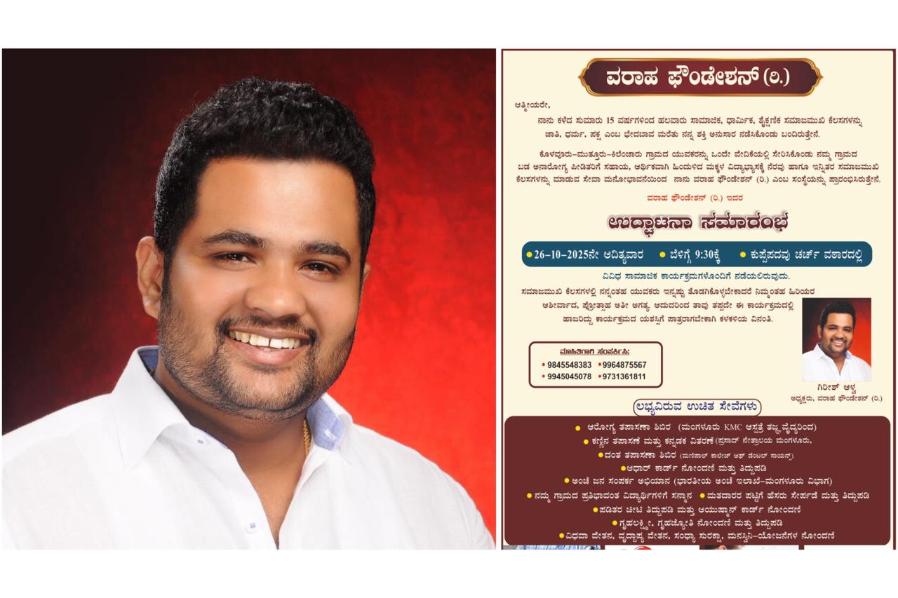 ಪುತ್ತೂರು : ಬಡ ಅನಾರೋಗ್ಯ ಪೀಡಿತರಿಗೆ ಸಹಾಯ, ಆರ್ಥಿಕವಾಗಿ ಹಿಂದುಳಿದ ಮಕ್ಕಳ ವಿದ್ಯಾಭ್ಯಾಸಕ್ಕೆ ನೆರವು, ಹಾಗೂ ಇನ್ನಿತರ ಸಮಾಜಮುಖಿ ಕೆಲಸಗಳನ್ನು ಮಾಡುವ ಉದ್ದೇಶದಿಂದ ಗಿರೀಶ್ ಆಳ್ವ ಅವರ ನೇತೃತ್ವದಲ್ಲಿ ಪ್ರಾರಂಭಿಸಿದ ವರಾಹ ಫೌಂಡೇಶನ್ ( ರಿ ) ಇದರ ಉದ್ಘಾಟನಾ ಸಮಾರಂಭ ನಾಳೆ (26-10-2025) ಬೆಳಗ್ಗೆ 9.30 ಕ್ಕೆ ಕುಪ್ಪೆಪದವು ಚರ್ಚ್ ವಠಾರದಲ್ಲಿ ನಡೆಯಲಿದೆ ಎಂದು ಸಂಘಟಕರು ತಿಳಿಸಿದ್ದಾರೆ.