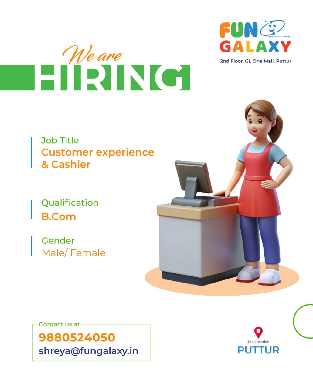 ಪುತ್ತೂರು: ಕಸ್ಟಮರ್ ಎಕ್ಸ್ಪೀರಿಯನ್ಸ್ ಮತ್ತು ಕ್ಯಾಶರ್ ಹುದ್ದೆಗೆ ಬಿ.ಕಾಂ ಆದ ಪುರುಷ ಅಥವಾ ಮಹಿಳಾ ಅಭ್ಯರ್ಥಿ ಬೇಕಾಗಿದ್ದಾರೆ. ಹೆಚ್ಚಿನ ಮಾಹಿತಿಗಾಗಿ ಸಂಪರ್ಕಿಸಿ 9880524050 / shreya@fungalaxy.in
