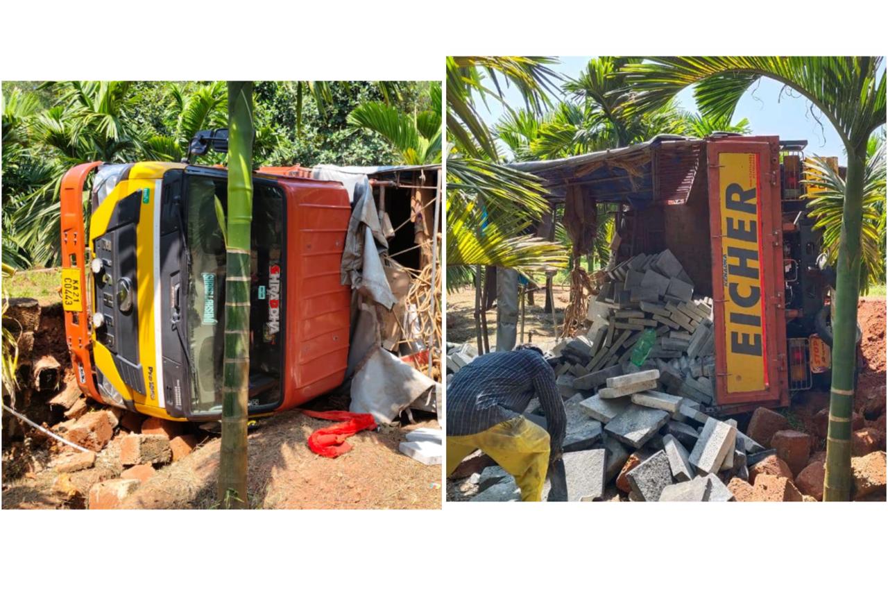 ಸುಳ್ಯ: ಅಜ್ಜಾವರ ಗ್ರಾಮದ ಮುಳ್ಯದಲ್ಲಿ ಹೊಸ ಮನೆಯ ಅಂಗಳಕ್ಕೆ ಇಂಟ‌ರ್ ಕಾಲ್ ಅಳವಡಿಸಲು ಲಾರಿಯಲ್ಲಿ ಇಂಟರ್ ಲಾಕ್ ತುಂಬಿ ಕೊಂಡು ಹೋಗುತ್ತಿದ್ದಾಗ ಆ ಲಾರಿ ಪಲ್ಟಿಯಾಗಿದೆ.