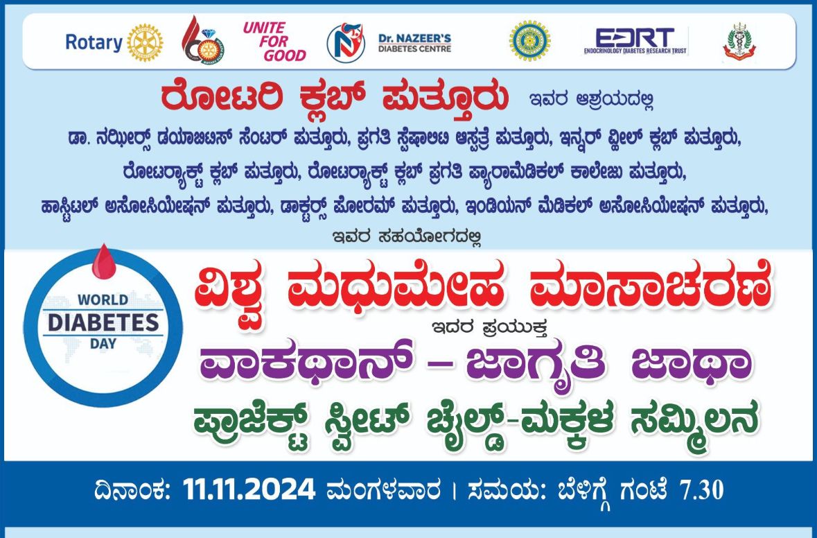 ಪುತ್ತೂರು: ವಿಶ್ವ ಮಧುಮೇಹ ದಿನಾಚರಣೆ ಅಂಗವಾಗಿ ರೋಟರಿ ಕ್ಲಬ್ ಪುತ್ತೂರು ಹಾಗೂ ಡಾ. ನಝೀರ್ ಡಯಾಬಿಟಿಸ್ ಸೆಂಟರ್ ಪುತ್ತೂರು ಇದರ ನೇತೃತ್ವದಲ್ಲಿ ವಿಶ್ವ ಮಧುಮೇಹ ಜಾಗೃತಿ ವಾಕಥಾನ್ ಹಾಗೂ ಮಧುಮೇಹ ಅರಿವು ಕಾರ್ಯಕ್ರಮವು ನವೆಂಬರ್ 11, 2025 (ಮಂಗಳವಾರ) ಬೆಳಿಗ್ಗೆ 7.30ರಿಂದ ನಡೆಯಲಿದೆ.