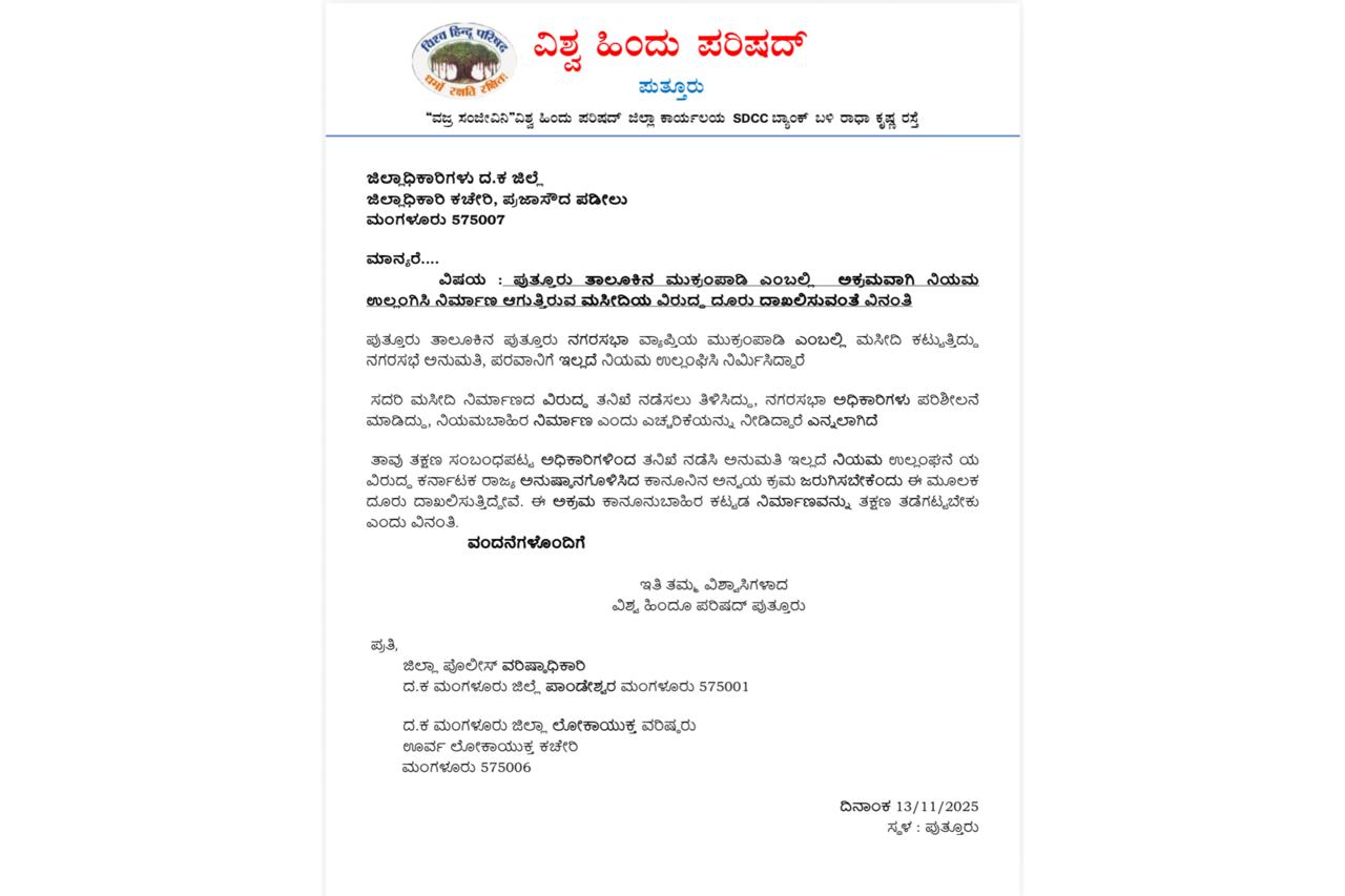 ಪುತ್ತೂರು: ಮುಕ್ರಂಪಾಡಿಯಲ್ಲಿ ನಗರಸಭೆ ಅನುಮತಿ, ಪರವಾನಿಗೆ ಇಲ್ಲದೆ ನಿಯಮ ಉಲ್ಲಂಘಿಸಿ ಮಸೀದಿ ಕಟ್ಟಡ ನಿರ್ಮಾಣ ಮಾಡುತ್ತಿದ್ದಾರೆಂದು ಆರೋಪಿಸಿ ವಿಶ್ವಹಿಂದು ಪರಿಷತ್ ಪುತ್ತೂರು ವತಿಯಿಂದ ಜಿಲ್ಲಾಧಿಕಾರಿಗೆ ದೂರು ನೀಡಿದ್ದಾರೆ.