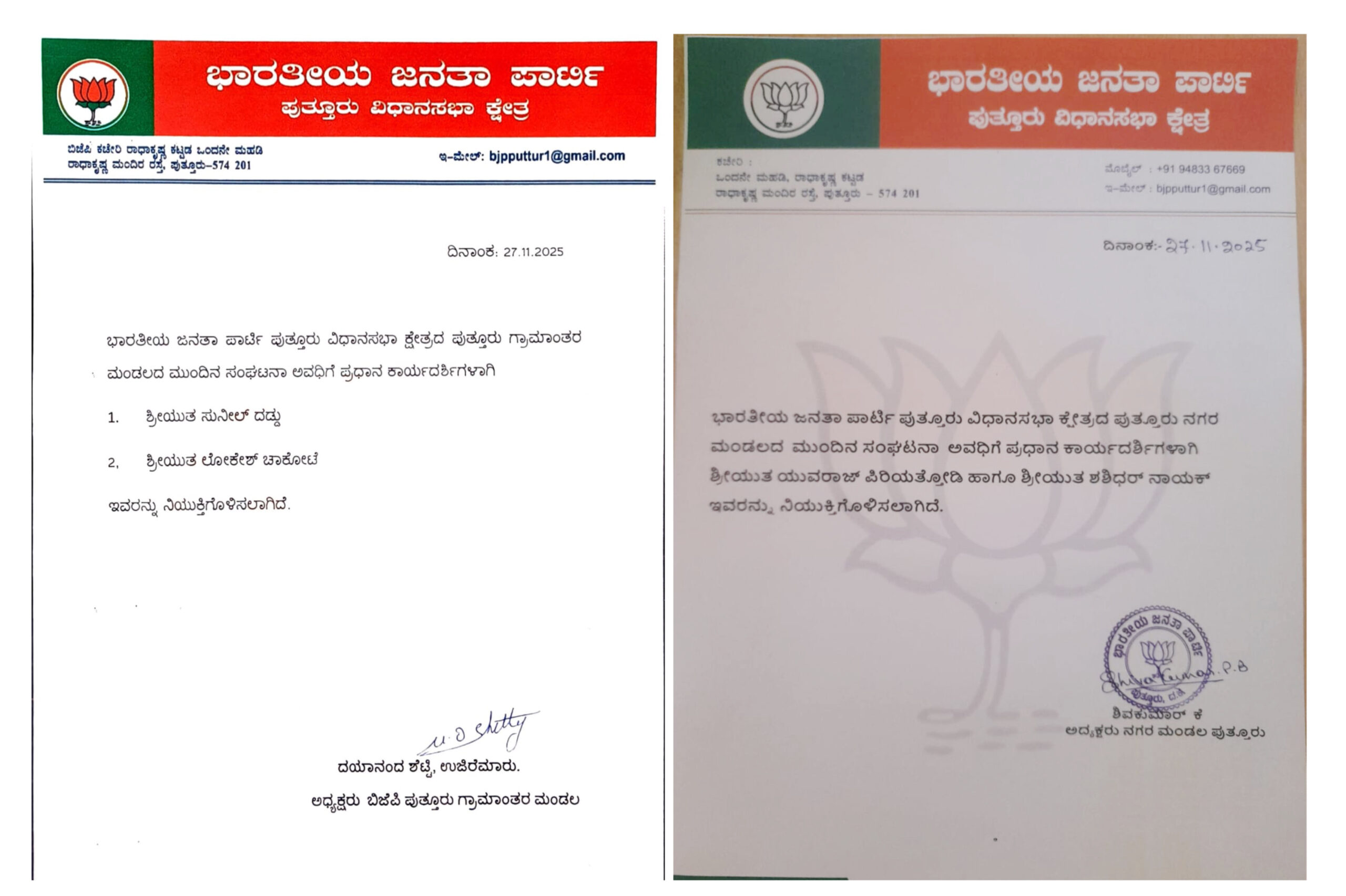 ಪುತ್ತೂರು : ಭಾರತೀಯ ಜನತಾ ಪಾರ್ಟಿ ಪುತ್ತೂರು ವಿಧಾನಸಭಾ ಕ್ಷೇತ್ರದ ಪುತ್ತೂರು ಗ್ರಾಮಾಂತರ ಮಂಡಲದ ಮುಂದಿನ ಸಂಘಟನಾ ಅವಧಿಗೆ ಪ್ರಧಾನ ಕಾರ್ಯದರ್ಶಿಗಳಾಗಿ ಸುನೀಲ್ ದಡ್ಡು, ಲೋಕೇಶ್ ಚಾಕೋಟೆ, ನಗರ ಮಂಡಲದ ಮುಂದಿನ ಸಂಘಟನಾ ಅವಧಿಗೆ ಪ್ರಧಾನ ಕಾರ್ಯದರ್ಶಿಗಳಾಗಿ ಯುವರಾಜ್ ಪಿರಿಯತ್ತೋಡಿ ಹಾಗೂ ಶಶಿಧರ್ ನಾಯಕ್ ಇವರನ್ನು ನಿಯುಕ್ತಿಗೊಳಿಸಿ ಆದೇಶ ಹೊರಡಿಸಲಾಗಿದೆ.