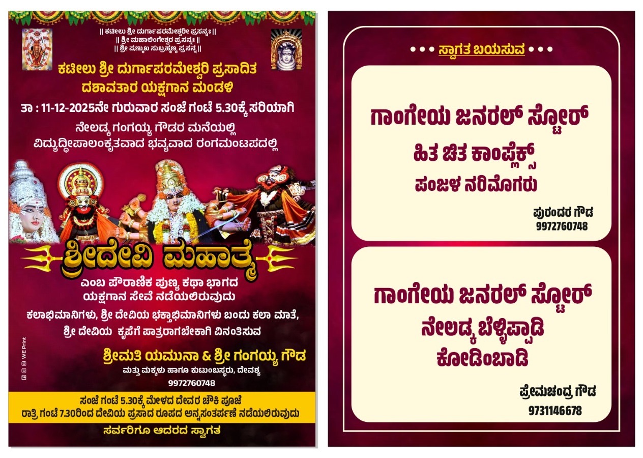 (ಡಿ.11): ಬೆಳ್ಳಿಪಾಡಿ ನೇಲಡ್ಕ ಗಂಗಯ್ಯ ಗೌಡರ ಮನೆಯಲ್ಲಿ ಶ್ರೀದೇವಿ ಮಹಾತ್ಮೆ ಯಕ್ಷಗಾನ..!!!