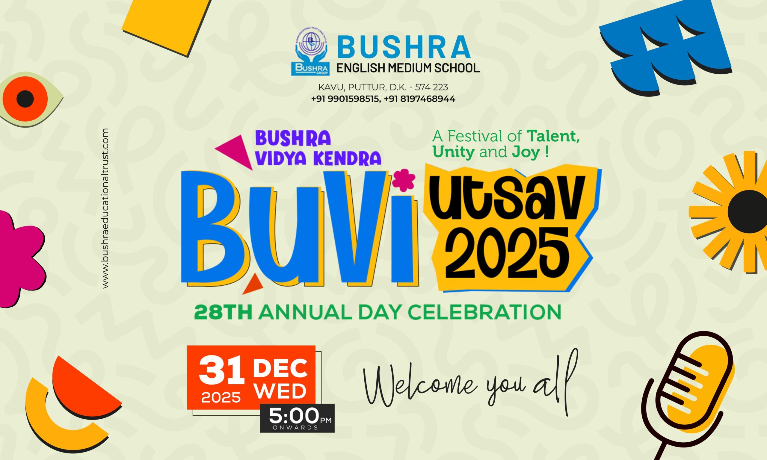 ಕಾವು: ಬುಶ್ರಾ ಆಂಗ್ಲಮಾಧ್ಯಮ ಶಾಲೆಯಲ್ಲಿ ಸಾಂಸ್ಕೃತಿಕ, ಸಭಾ ಕಾರ್ಯಕ್ರಮದೊಂದಿಗೆ 28ನೇ ವರ್ಷದ ವಾರ್ಷಿಕೋತ್ಸವ ‘ಬುವಿ ಉತ್ಸವ- 2025’ ಕಾರ್ಯಕ್ರಮ ಶಾಲಾ ಆವರಣದಲ್ಲಿ ಡಿ.31 ರಂದು ನಡೆಯಲಿದೆ.