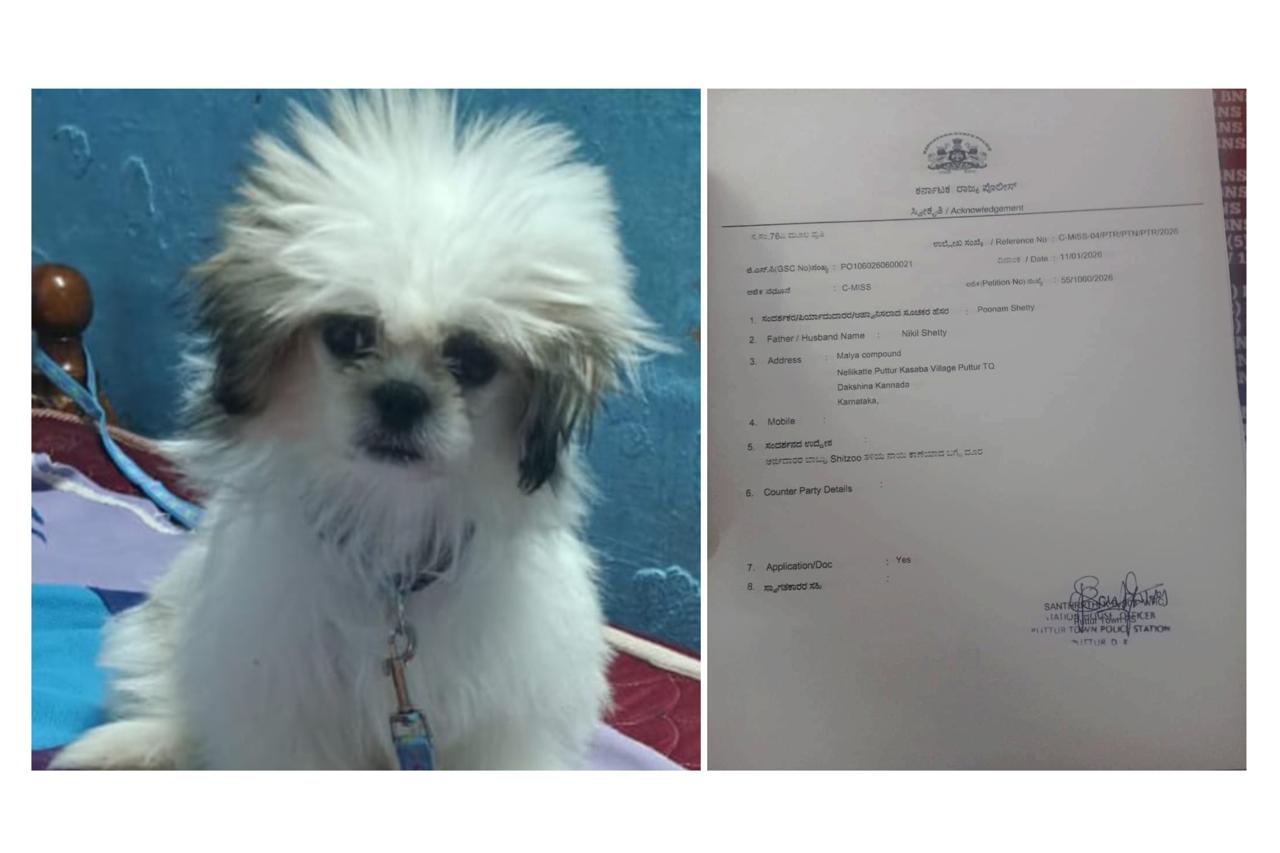 ಪುತ್ತೂರು: ಪ್ರೀತಿಯಿಂದ ಸಾಕಿದ್ದ shitzoo ತಳಿಯ ನಾಯಿ ಕಾಣೆಯಾಗಿರುವ ಬಗ್ಗೆ ಪುತ್ತೂರು ನಗರ ಪೊಲೀಸ್ ಠಾಣೆಯಲ್ಲಿ ಪ್ರಕರಣ ದಾಖಲಾಗಿದೆ.