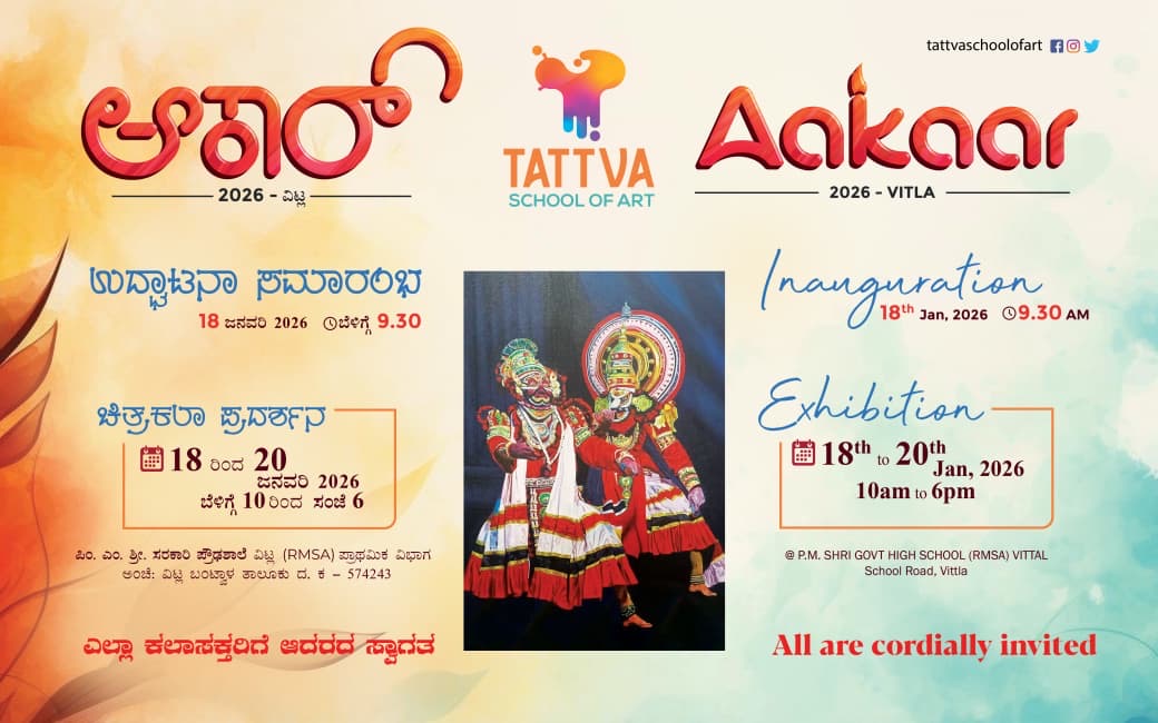 ವಿಟ್ಲ: ತತ್ವ ಸ್ಕೂಲ್ ಆಫ್ ಆರ್ಟ್ ಅರ್ಪಿಸುವ ಆಕಾರ್ 2026 ಚಿತ್ರಕಲಾ ಪ್ರದರ್ಶನವು ಪಿ.ಎಂ.ಶ್ರೀ ಸರಕಾರಿ ಪ್ರೌಢಶಾಲೆಯ ಪ್ರಾಥಮಿಕ ವಿಭಾಗದಲ್ಲಿ ಜ. 18 ರಿಂದ ಜ 20 ವರೆಗೆ ನಡೆಯಲಿದೆ ಎಂದು ಆಯೋಜಕರು ಪ್ರಕಟಣೆಯಲ್ಲಿ ತಿಳಿಸಿದ್ದಾರೆ.