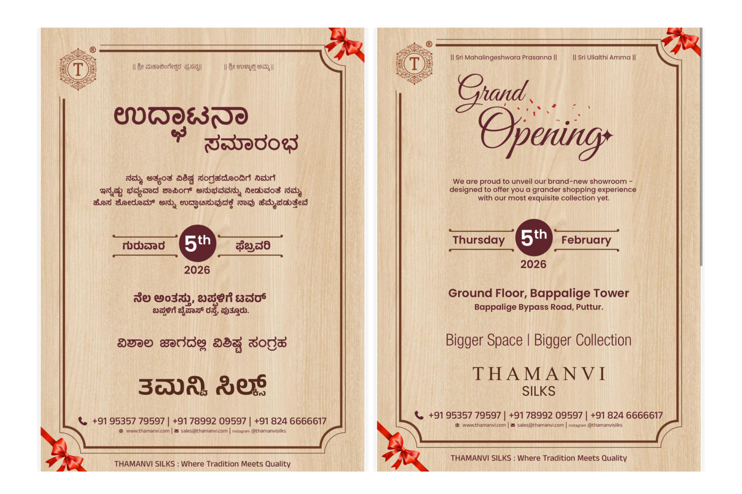 ಪುತ್ತೂರು: ಬೈಪಾಸ್ ರಸ್ತೆಯ ಬಪ್ಪಳಿಗೆ ಟವರ್ ನಲ್ಲಿ ತಮನ್ವಿ ಸಿಲ್ಕ್ಸ್ ಫೆ.05 ರಂದು ಶುಭಾರಂಭಗೊಳ್ಳಲಿದೆ.
