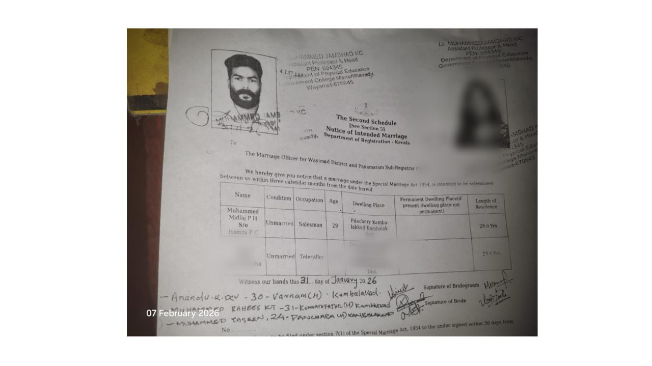 ಫೆ‌.7ರಂದು ವೈಶಾಲಿಯು ಮೊಹಮ್ಮದ್ ಮಿದ್ಲಾಜ್ ಪಿ.ಹೆಚ್. ಎಂಬ ಅನ್ಯಕೋಮಿನ ಯುವಕನೊಂದಿಗೆ ಕೇರಳದ ವಯನಾಡ್ ರಿಜಿಸ್ಟರ್ ಆಫೀಸಿನಲ್ಲಿ ಜ.31ರಂದು ರಿಜಿಸ್ಟರ್ ಮದುವೆಯಾಗಿರುವ ಬಗ್ಗೆ ವಾಟ್ಸ್‌ಆ್ಯಪ್ ಸಂದೇಶ ವೈಶಾಲಿಯ ಸಂಬಂಧಿ ಹರಿದಾಸ್ ಎಂಬವರು ಗಮನಿಸಿದ್ದರು.