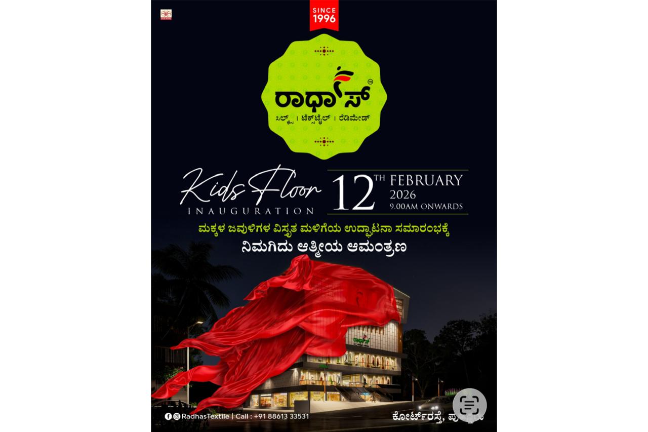 ಪುತ್ತೂರು ನಗರದ ಕೋರ್ಟ್ ರಸ್ತೆದಲ್ಲಿರುವ ಪ್ರಸಿದ್ಧ ರಾಧಾ’ಸ್ ಜವುಳಿ ಮಳಿಗೆಯಲ್ಲಿ ಗ್ರಾಹಕರ ಅನುಕೂಲಕ್ಕಾಗಿ ಮಕ್ಕಳ ಜವುಳಿಗಳ ವಿಶೇಷ ಮತ್ತು ವಿಸ್ತೃತ ಮಳಿಗೆ ‘ಕಿಡ್ಸ್ ಫ್ಲೋರ್’ ಫೆಬ್ರವರಿ 12ರಂದು ಶುಭಾರಂಭಗೊಳ್ಳಲಿದೆ.