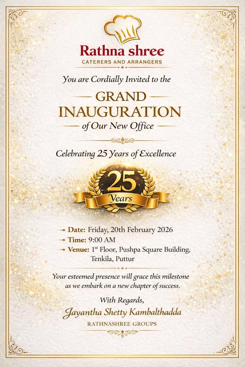 ಪುತ್ತೂರಿನಾದ್ಯಂತ ಮನೆಮಾತಾಗಿರುವ ರತ್ನಶ್ರೀ ಕ್ಯಾಟರರ್ಸ್ & ಅರೆಂಜರ್ಸ್ ತನ್ನ 25 ನೇ ವರ್ಷದ ಸಂಭ್ರಮದಲ್ಲಿದ್ದು ಈ ಶುಭ ಸಂದರ್ಭದಲ್ಲಿ ನೂತನ ಕಚೇರಿ ಫೆ.20 ರಂದು ಶುಭಾರಂಭಗೊಳ್ಳಲಿದೆ.