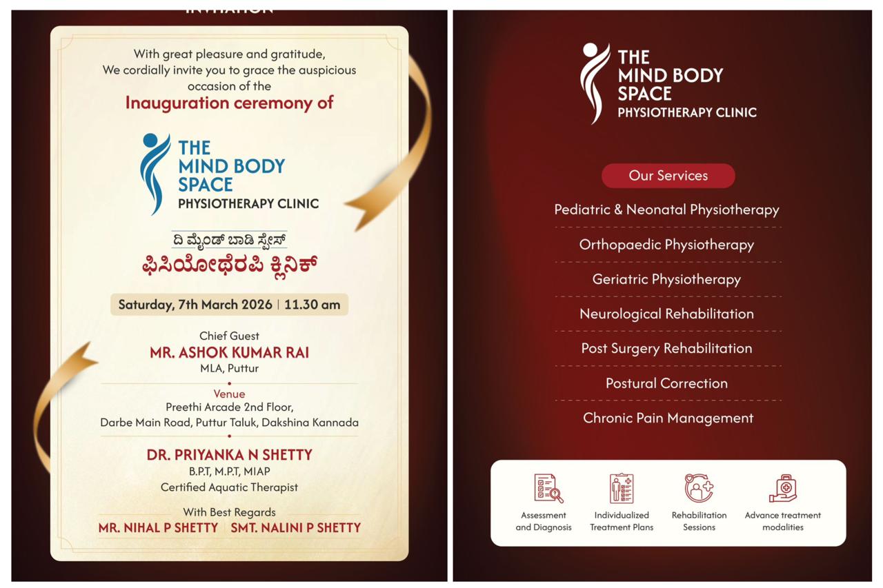 ಪುತ್ತೂರು: ದಿ ಮೈಂಡ್ ಬಾಡಿ ಸ್ಪೇಸ್ ಪಿಸಿಯೋಥೆರಪಿ ಕ್ಲಿನಿಕ್ ಮಾ.07 ರಂದು ದರ್ಬೆಯ ಪ್ರೀತಿ ಆರ್ಕೇಡ್ ನ ಎರಡನೇ ಮಹಡಿಯಲ್ಲಿ ಶುಭಾರಂಭಗೊಳ್ಳಲಿದೆ.