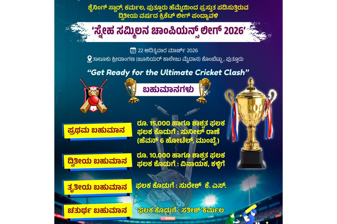 ಪುತ್ತೂರು: ಶೈನಿಂಗ್ ಸ್ಟಾರ್, ಕರ್ಮಲ ಪುತ್ತೂರು ಇದರ ಆಶ್ರಯದಲ್ಲಿ ದ್ವಿತೀಯ ವರ್ಷದ ಕ್ರಿಕೆಟ್ ಲೀಗ್ ಪಂದ್ಯಾವಳಿ ‘ಸ್ನೇಹ ಸಮ್ಮಿಲನ ಚಾಂಪಿಯನ್ಸ್‌ ಲೀಗ್ 2026’ ಇದೇ ಬರುವ ಮಾರ್ಚ್ 22ರಂದು (ಆದಿತ್ಯವಾರ) ಪುತ್ತೂರಿನ ಜೂನಿಯರ್ ಕಾಲೇಜು ಮೈದಾನದಲ್ಲಿ ನಡೆಯಲಿದೆ.