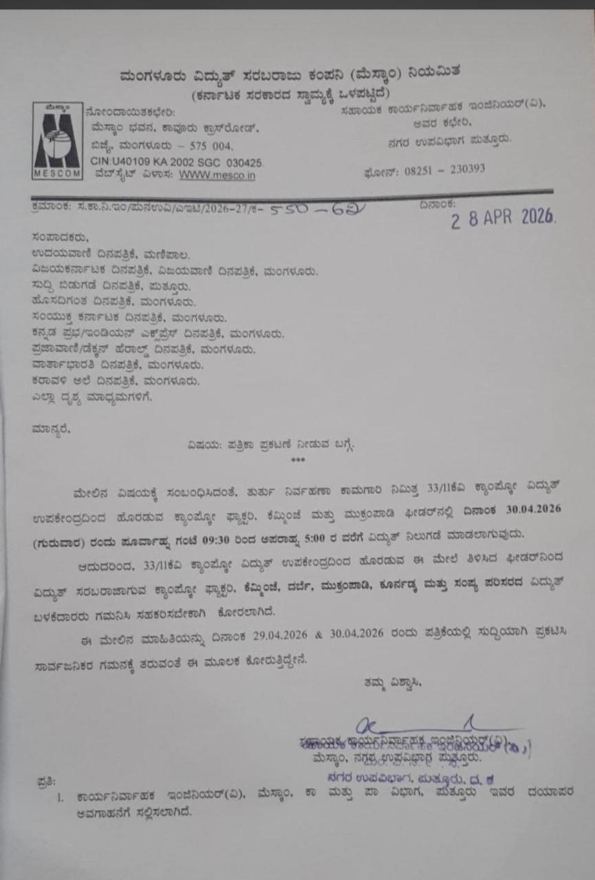 ಆದುದರಿಂದ 33/11 ಕೆವಿ ಕ್ಯಾಂಪ್ಕೋ ವಿದ್ಯುತ್ ಉಪಕೇಂದ್ರದಿಂದ ಹೊರಡುವ ಮೇಲೆ ತಿಳಿಸಿದ ಫೀಡರ್ನಿಂದ ವಿದ್ಯುತ್ ಸರಬರಾಜಾಗುವ ಕ್ಯಾಂಪ್ಕೋ ಫ್ಯಾಕ್ಟರಿ, ಕೆಮ್ಮಿಂಜೆ, ದರ್ಬೆ, ಮುಕ್ರಂಪಾಡಿ, ಕೂರ್ನಡ್ಕ ಮತ್ತು ಸಂಪ್ಯ ಪರಿಸರದ ವಿದ್ಯುತ್ ಬಳಕೆದಾರರು ಗಮನಿಸಿ ಸಹಕರಿಸುವಂತೆ ಮೆಸ್ಕಾಂ ಪ್ರಕಟಣೆ ತಿಳಿಸಿದೆ.