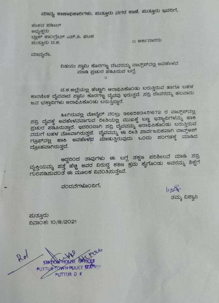 ದೈವವನ್ನು ಈ ರೀತಿಯಾಗಿ ಸಾರ್ವಜನಿಕವಾಗಿ ವಾಟ್ಸಪ್ ಗ್ರೂಪಿನಲ್ಲಿ ಅವಹೇಳನ ಮಾಡುತ್ತಿರುವುದು ಒಂದು ಪಂಗಡಕ್ಕೆ ಮಾಡಿದ ದ್ರೋಹವಾಗಿರುತ್ತದೆ, ತುಳುನಾಡಿನ ಜನರ ಧಾರ್ಮಿಕ ಭಾವನೆಗಳಿಗೆ ಘಾಸಿ ಉಂಟುಮಾಡಿದ ಆರೋಪಿಗಳನ್ನು ಆದಷ್ಟು ಶೀಘ್ರವಾಗಿ ಬಂಧಿಸುವಂತೆ ಕಾಂಗ್ರೆಸ್ ಎಸ್ಸಿ ಘಟಕದಿಂದ ಪುತ್ತೂರು ಪೋಲಿಸ್ ಠಾಣೆಯಲ್ಲಿ ಇಂದು ದೂರು ದಾಖಲಿಸಲಾಯಿತು.