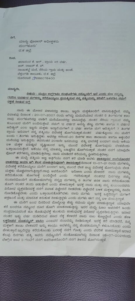 ಜುಲೈ 11ರಂದು ಊರಿಗೆ ಬಂದಿರುವ ಆಕೆ, ತನಗೆ ಉಗ್ರ ಸಂಘಟನೆಯೊಂದಿಗೆ ನಂಟಿದ್ದು, 12 ವರ್ಷದ ಮಗಳನ್ನು ತನ್ನೊಂದಿಗೆ ಕಳುಹಿಸಬೇಕು ಎಂದು ಒತ್ತಾಯಿಸುತ್ತಿದ್ದಾಳೆ. ಅಲ್ಲದೆ ಲಕ್ಷದ್ವೀಪದಿಂದ ಮೊಹಮ್ಮದ್ ಇಶಾಕ್ ಎಂಬಾತನೂ ಕರೆ ಮಾಡಿ ನಿನ್ನ ಮಗಳನ್ನು ಪತ್ನಿಯನ್ನು ಕಳಿಸಿಕೊಡು, ಎಷ್ಟು ಹಣ ಬೇಕು ಕೇರಳಕ್ಕೆ ಬಂದಲ್ಲಿ ಕೊಡುವೆ ಎಂದು ಹೇಳುತ್ತಿದ್ದಾನೆ ಎಂದು ಚಿದಾನಂದ್ ಹೇಳಿದ್ದಾರೆ.