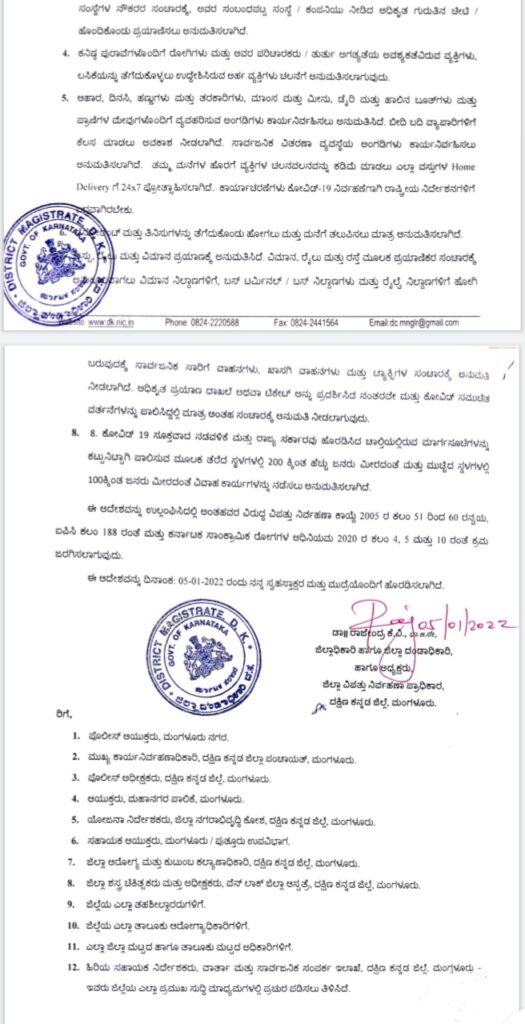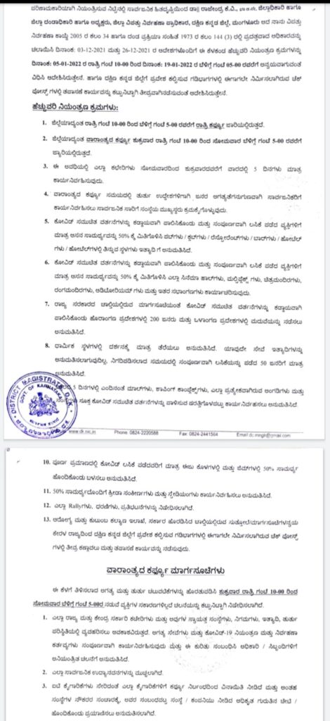 - ಜಿಲ್ಲೆಯಾದ್ಯಂತ ರಾತ್ರಿ ಗಂಟೆ 10-00 ರಿಂದ ಬೆಳಿಗ್ಗೆ ಗಂಟೆ 5-00 ರವರೆಗೆ ರಾತ್ರಿ ಕರ್ಫ್ಯೂ ಜಾರಿಯಲ್ಲಿರುತ್ತದೆ.