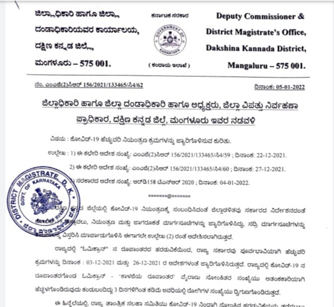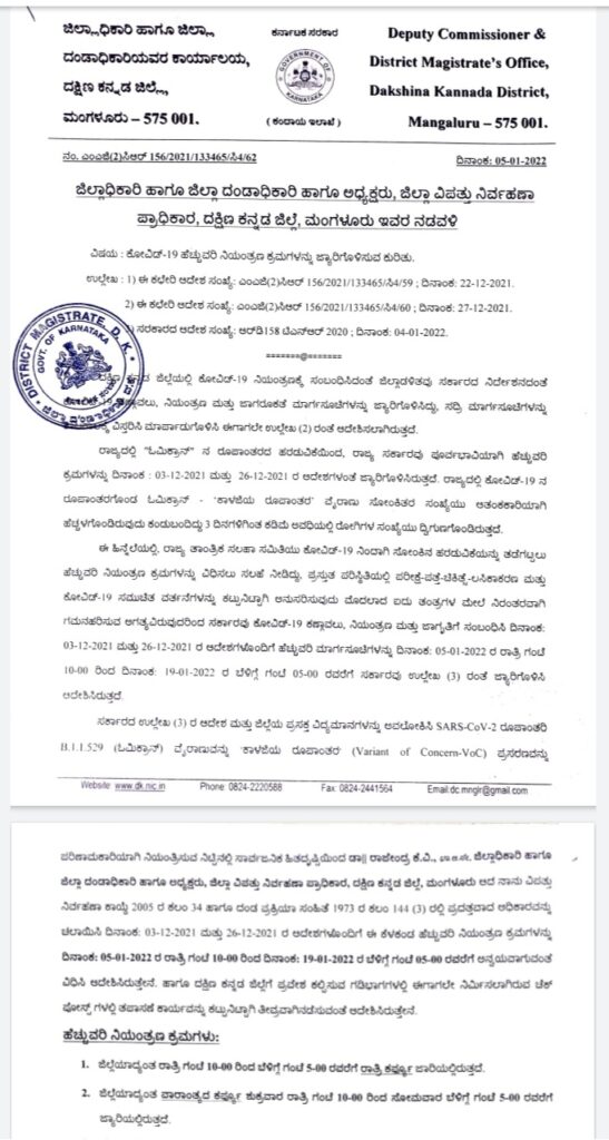 ಮಂಗಳೂರು : ದಕ್ಷಿಣ ಕನ್ನಡ ಜಿಲ್ಲೆಯಲ್ಲೂ ಕೊರೊನಾ ಸೋಂಕು ದಿನದಿಂದ ದಿನಕ್ಕೆ ಹೆಚ್ಚುತ್ತಿದ್ದು, ಈ ಪೈಕಿ ಓಮಿಕ್ರಾನ್ ಪ್ರಕರಣಗಳೇ ಹೆಚ್ಚು ಅನ್ನುವ ಮಾಹಿತಿಯನ್ನು ಆರೋಗ್ಯ ಇಲಾಖೆಯ ಮೂಲಗಳು ದೃಢಪಡಿಸಿದ್ದು, ಈ ಹಿನ್ನೆಲೆಯಲ್ಲಿ ದಕ್ಷಿಣ ಕನ್ನಡ ಜಿಲ್ಲಾಧಿಕಾರಿಯವರು ಹೆಚ್ಚುವರಿ ನಿಯಂತ್ರಣ ಕ್ರಮಗಳನ್ನು ಜಾರಿಗೊಳಿಸಿದ್ದಾರೆ.
