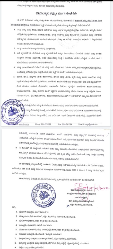 - ಜಿಲ್ಲೆಯಾದ್ಯಂತ ವಾರಾಂತ್ಯದ ಕರ್ಪ್ಯೂ ಶುಕ್ರವಾರ ರಾತ್ರಿ ಗಂಟೆ 10-00 ರಿಂದ ಸೋಮವಾರ ಬೆಳಿಗ್ಗೆ ಗಂಟೆ 5-00 ರವರೆಗೆ ಜಾರಿಯಲ್ಲಿರುತ್ತದೆ.