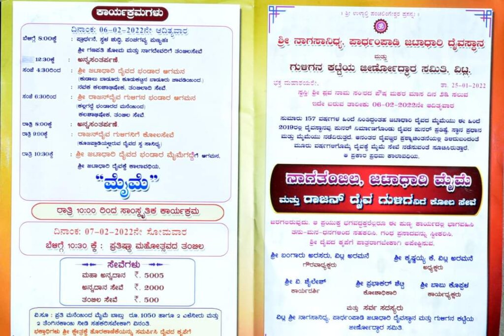 ವಿಟ್ಲ: ಶ್ರೀ ನಾಗ ಸಾನಿಧ್ಯ ಪಾರ್ಥಪಾಡಿ ಜಟಾಧಾರಿ ದೈವಸ್ಥಾನ ಮತ್ತು ಗುಳಿಗನ ಕಟ್ಟೆ ಜೀರ್ಣೋದ್ಧಾರ ಸಮಿತಿ ವತಿಯಿಂದ ನಾಗತಂಬಿಲ ಜಟಾಧಾರಿ ಮೈಮೆ ಮತ್ತು ರಾಜನ್ ದೈವದ ಗುಳಿಗನಿಗೆ ಕೋಲ ಸೇವೆ ಫೆಬ್ರವರಿ 6ರಂದು ನಡೆಯಲಿದ್ದು, ಇದರ ಆಮಂತ್ರಣ ಪತ್ರಿಕೆ ಬಿಡುಗಡೆ ಸಮಾರಂಭ ವಿಟ್ಲ ಶ್ರೀ ಪಂಚಲಿಂಗೇಶ್ವರ ದೇವಸ್ಥಾನದಲ್ಲಿ ನಡೆಯಿತು.
