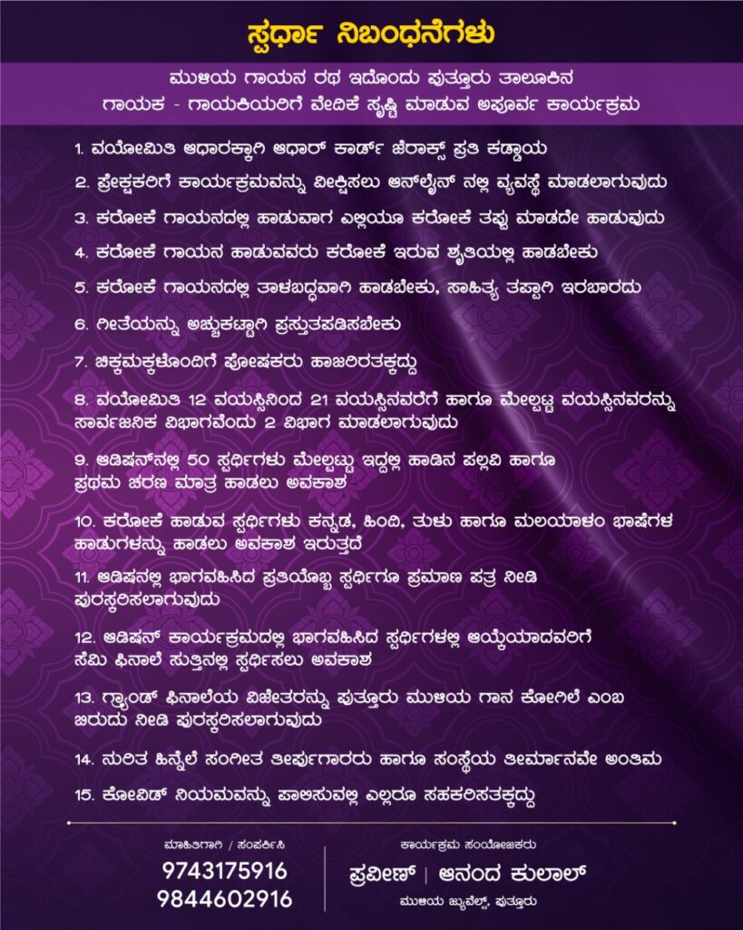 ಸ್ಪರ್ಧೆಯಲ್ಲಿ ಭಾಗವಹಿಸುವವರ ವಯೋಮಿತಿ 12 ರಿಂದ 21 ವರ್ಷ, ಸಾರ್ವಜನಿಕರ ವಿಭಾಗದಲ್ಲಿ 21 ವರ್ಷ ಮೇಲ್ಪಟ್ಟು ಆಗಿರಬೇಕು. ಕನ್ನಡ, ಹಿಂದಿ, ತುಳು ಹಾಗೂ ಮಲಯಾಳಂ ನಾಲ್ಕು ಭಾಷೆಯ ಹಾಡುಗಳಿಗೆ ಮಾತ್ರ ಅವಕಾಶ ನೀಡಲಾಗಿದೆ.