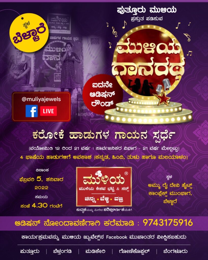 ಪುತ್ತೂರು: ಮುಳಿಯ ಪ್ರಸ್ತುತ ಪಡಿಸುವ ಮುಳಿಯ “ಗಾನರಥ” ಐದನೇ ಆಡಿಷನ್ ರೌಂಡ್ ಕರೋಕೆ ಹಾಡುಗಳ ಗಾಯನ ಸ್ಪರ್ಧೆಯು ಫೆ.5 ರಂದು ಸಂಜೆ ಬೆಳ್ಳಾರೆ ಅಮ್ಮು ರೈ ದೇವಿ ಹೈಟ್ಸ್ ಕಾಂಪ್ಲೆಕ್ಸ್ ನ ಮುಂಭಾಗದಲ್ಲಿ ನಡೆಯಲಿದೆ.