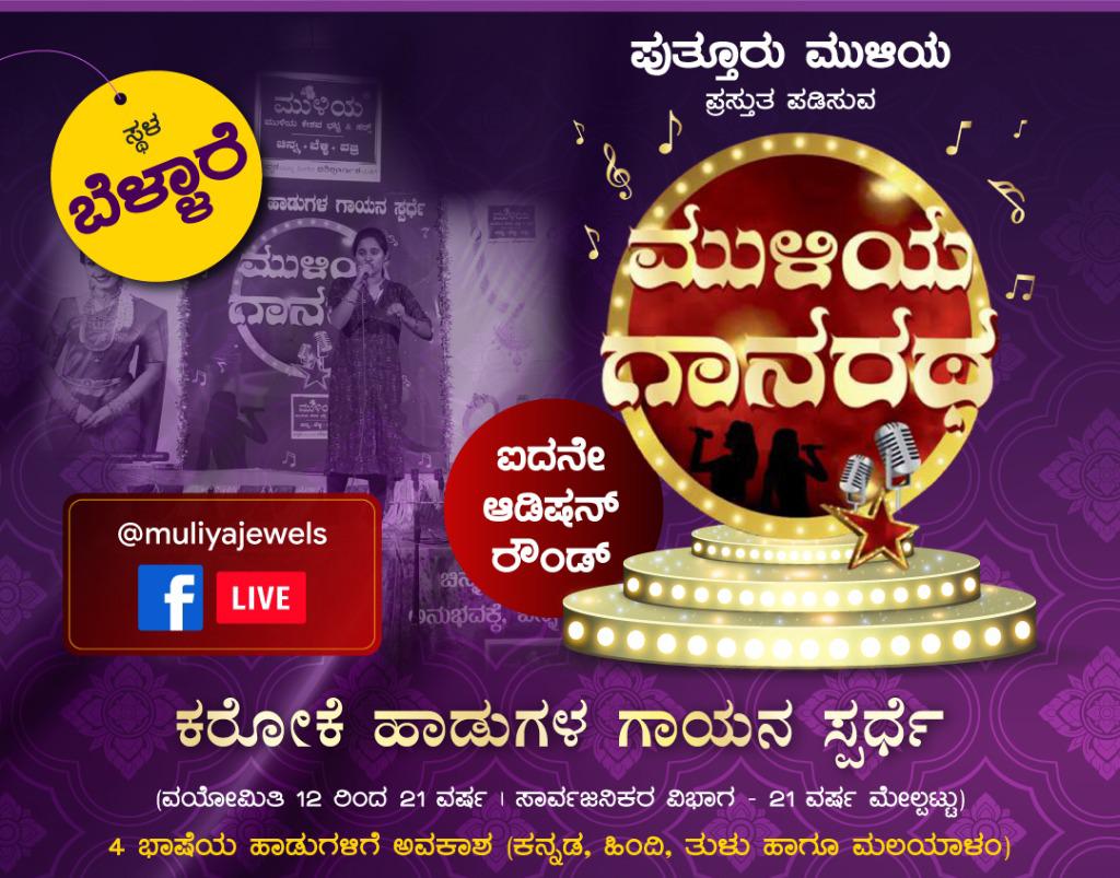 ಪುತ್ತೂರು: ಮುಳಿಯ ಪ್ರಸ್ತುತ ಪಡಿಸುವ ಮುಳಿಯ “ಗಾನರಥ” ಐದನೇ ಆಡಿಷನ್ ರೌಂಡ್ ಕರೋಕೆ ಹಾಡುಗಳ ಗಾಯನ ಸ್ಪರ್ಧೆಯು ಫೆ.5 ರಂದು ಸಂಜೆ ಬೆಳ್ಳಾರೆ ಅಮ್ಮು ರೈ ದೇವಿ ಹೈಟ್ಸ್ ಕಾಂಪ್ಲೆಕ್ಸ್ ನ ಮುಂಭಾಗದಲ್ಲಿ ನಡೆಯಲಿದೆ.