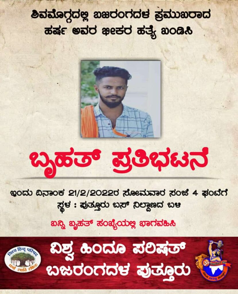 ಪುತ್ತೂರು: ಶಿವಮೊಗ್ಗದಲ್ಲಿ ನಡೆದ ಬಜರಂಗದಳ ಕಾರ್ಯಕರ್ತ ಹರ್ಷ ರವರ ಹತ್ಯೆ ಯನ್ನು ಖಂಡಿಸಿ ವಿಶ್ವ ಹಿಂದೂ ಪರಿಷದ್ ಬಜರಂಗದಳ ಪುತ್ತೂರು ವತಿಯಿಂದ ಫೆ.21 ರಂದು ಸಂಜೆ ಪುತ್ತೂರು ಬಸ್ ನಿಲ್ದಾಣದ ಬಳಿಯ ಗಾಂಧೀ ಕಟ್ಟೆಯ ಬಳಿ ‘ಬೃಹತ್ ಪ್ರತಿಭಟನೆ’ ನಡೆಯಲಿದೆ.