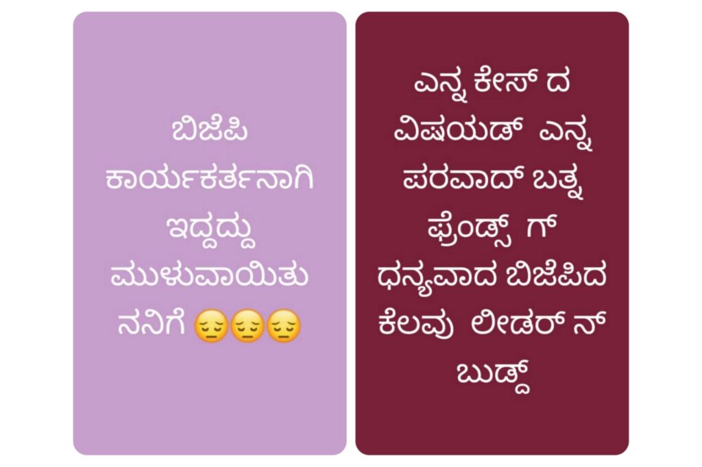 ‘ಬಿಜೆಪಿ ಕಾರ್ಯಕರ್ತನಾಗಿದ್ದೆ ನನಗೆ ಮುಳುವಾಯಿತು’, ಎಂದೆಲ್ಲಾ ಬರೆದುಕೊಂಡು ಯುವಕ ಬೇಸರ ವ್ಯಕ್ತ ಪಡಿಸಿದ್ದು,ಸಾಮಾಜಿಕ ಜಾಲತಾಣಗಳಲ್ಲಿ ಈ ವಿಚಾರ ಭಾರೀ ಚರ್ಚೆಯಾಗುತ್ತಿದೆ.