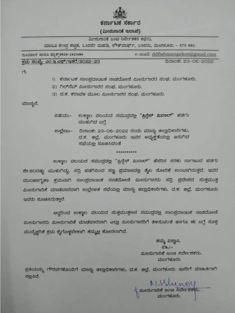 ಉಳ್ಳಾಲದ ಸುಮಾರು 1.5 ನಾಟಿಕಲ್ ಮೈಲು ದೂರದ ಅರಬ್ಬಿ ಸಮುದ್ರದಲ್ಲಿ ಅಪಾಯಕ್ಕೆ ಸಿಲುಕಿ ಮುಳುಗಡೆಯಾದ ‘ಪ್ರಿನ್ಸಸ್ ಮಿರಾಲ್’ ಕಾರ್ಗೋ ಹಡಗಿನಲ್ಲಿರುವ ಫರ್ನಸ್ ಆಯಿಲ್ ಮತ್ತು ಎಂಜಿನ್ ಆಯಿಲ್ ಕೂಡಲೇ ಹೊರತೆಗೆಯಲು ಸೂಚನೆ ನೀಡಲಾಗಿದೆ.