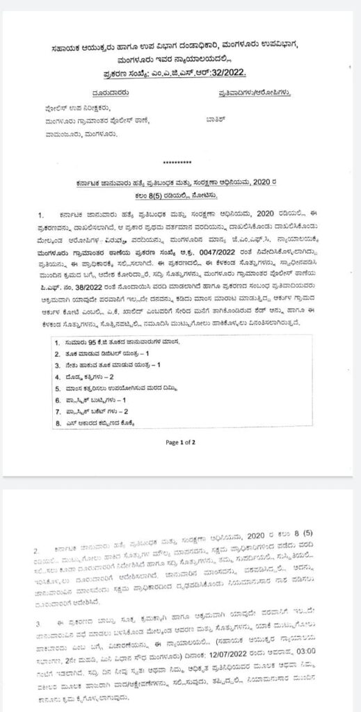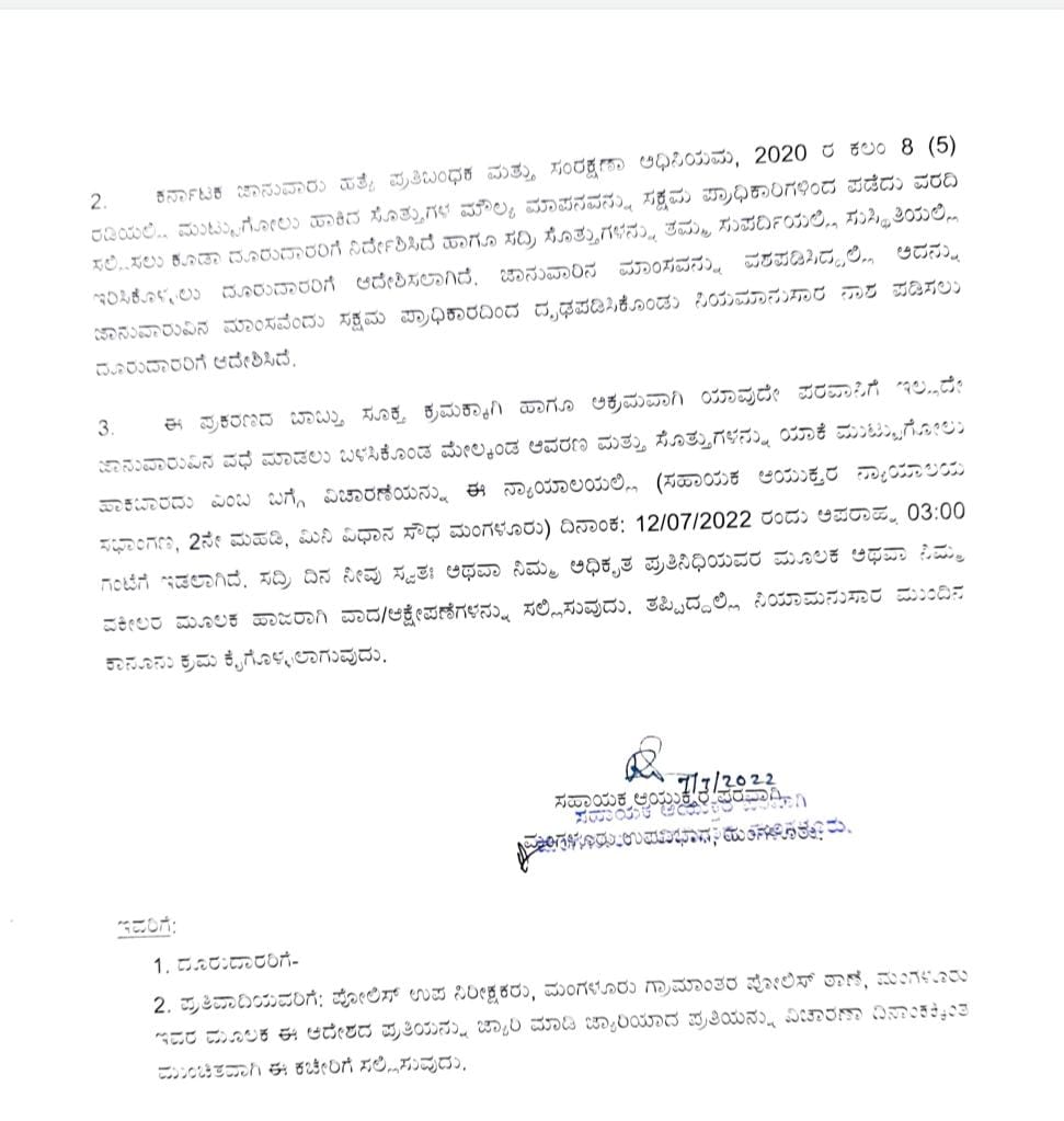 ಆರೋಪಿ ಯಾವುದೇ ಪರವಾನಗಿ ಇಲ್ಲದೆ ಜಾನುವಾರು ವಧೆ ಮಾಡಲು ಬಳಸಿಕೊಂಡ ಕಾರಣ ಕೃತ್ಯಕ್ಕೆ ಬಳಸಿದ ಸ್ಥಳ ಮತ್ತು ಸೊತ್ತುಗಳನ್ನು ಯಾಕೆ ಮುಟ್ಟುಗೋಲು ಹಾಕಬಾರದು ಎಂಬ ಬಗ್ಗೆ ವಿಚಾರಣೆ ಸಹಾಯಕ ಆಯುಕ್ತರ ನ್ಯಾಯಾಲಯ ಸಭಾಂಗಣದಲ್ಲಿ ಜು.12ರಂದು 3ಗಂಟೆಗೆ ನಡೆಯಲಿದೆ. ಈ ದಿನ ಅಧಿಕೃತ ಪ್ರತಿನಿಧಿ ಅಥವಾ ವಕೀಲರ ಮೂಲಕ ವಾದ, ಆಕ್ಷೇಪಣೆಗಳನ್ನು ಸಲ್ಲಿಸುವುದು. ತಪ್ಪಿದಲ್ಲಿ ನಿಯಾಮಾನುಸಾರ ಮುಂದಿನ ಕಾನೂನು ಕ್ರಮಕೈಗೊಳ್ಳಲಾಗುವುದು ಎಂದು ನೋಟಿಸಿನಲ್ಲಿ ಆಯುಕ್ತರು ತಿಳಿಸಿದ್ದಾರೆ.