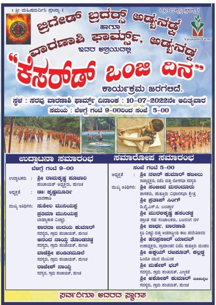 ವಿಟ್ಲ: ಬ್ರಿಗೇಡ್ ಬ್ರದರ್ಸ್ ಅಡ್ಯನಡ್ಕ ಹಾಗೂ ವಾರಣಾಶಿ ಫಾರ್ಮ್ಸ್, ಅಡ್ಯನಡ್ಕ ಇದರ ಆಶ್ರಯದಲ್ಲಿ ‘ಕೆಸರ್ಡ್ ಒಂಜಿ ದಿನ’ ಕಾರ್ಯಕ್ರಮ ಜು.10 ರಂದು ಸರವು ವಾರಣಾಶಿ ಫಾರ್ಮ್ಸ್ ನಲ್ಲಿ ನಡೆಯಲಿದೆ.