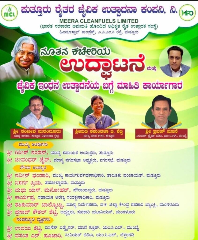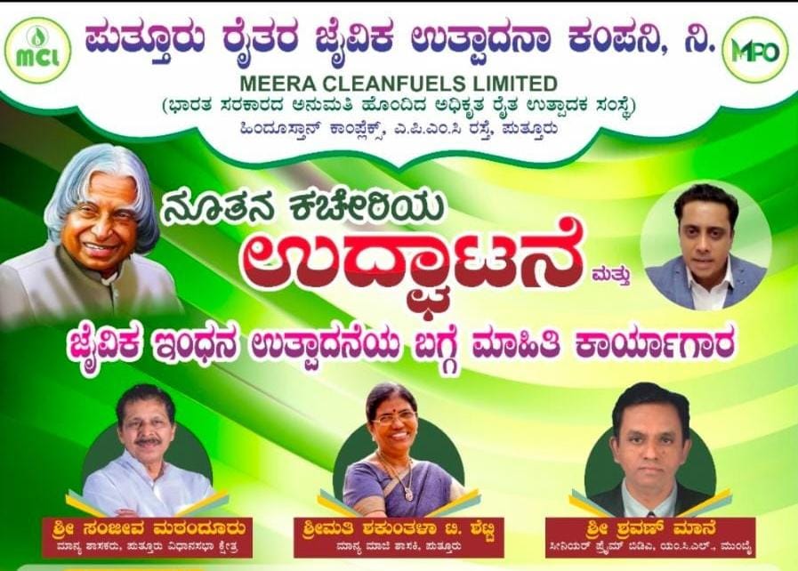ಭಾರತದ ವಿಜ್ಞಾನಿ , ಮಾಜಿ ರಾಷ್ಟ್ರಪತಿ ಎಪಿಜೆ ಅಬ್ದುಲ್ ಕಲಾಂ ಸಂಶೋಧನೆಯ ತಳಹದಿಯ ಮೇಲೆ ಪರಿಸರಕ್ಕೆ ಪೂರಕವಾದ ಬಯೋ ಇಂಧನಗಳನ್ನು ಉತ್ಪಾದಿಸಲು ಭಾರತದಾದ್ಯಂತ ಆಂದೋಲನಗಳು ಕೈಗೊಂಡು ರೈತರ ಮುಖಾಂತರ ಬೆಳೆಸಿದ ನೇಪಿಯರ್ ಗ್ರಾಸ್ (ಹುಲ್ಲು) ನಲ್ಲಿ ಬಯೋ ಡೀಸೆಲ್/ಬಯೋ ಸಿ. ಎನ್. ಜಿ/ಬಯೋ ಅಡುಗೆ ಅನಿಲ ತಯಾರಿ ಮಾಡುವ ಯೋಜನೆಯನ್ನು ಹಾಕಿಕೊಂಡು ಭಾರತ ಸರಕಾರದ ಅಧಿಕೃತವಾಗಿ ಅನುಮತಿ ಹೊಂದಿದ ರೈತ ಉತ್ಪಾದನಾ ಸಂಸ್ಥೆ “ಮೀರಾ ಕ್ಲೀನ್ ಫ್ಯುಯೆಲ್ಸ್ ಲಿಮಿಟೆಡ್” (MCL) ನ ಆಶ್ರಯದಲ್ಲಿ “ಪುತ್ತೂರು ರೈತರ ಜೈವಿಕ ಉತ್ಪಾದನಾ ಕಂಪನಿ ನಿಯಮಿತ “ಅಸ್ತಿತ್ವಕ್ಕೆ ಬರುತ್ತಿದೆ ಅಲ್ಲದೇ ಪ್ರತೀ ಗ್ರಾಮದಲ್ಲಿ ಒಬ್ಬ ರೈತರನ್ನು ಪ್ರವರ್ತಕರಾಗಿ ಆಯ್ಕೆಮಾಡಿ ಪ್ರತೀ ಗ್ರಾಮದಲ್ಲಿ ಜೈವಿಕ ಉತ್ಪಾದನಾ ಘಟಕಗಳನ್ನು ಸ್ಥಾಪಿಸಲು ಯೋಜನೆ ಹಮ್ಮಿಕೊಳ್ಳಲಾಗಿದೆ.