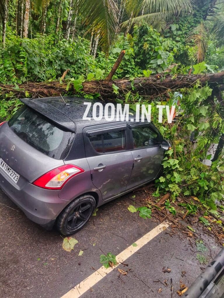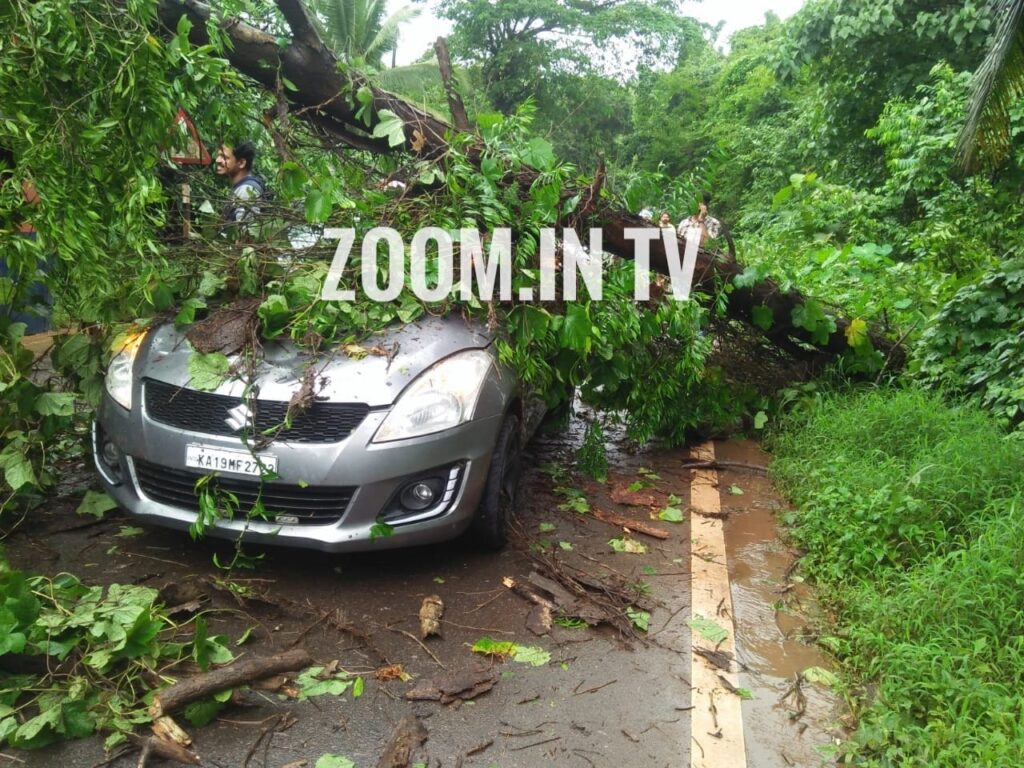 ಜು.13 ರಂದು ಮಧ್ಯಾಹ್ನ ಬೀಸಿದ ಭಾರೀ ಗಾಳಿಗೆ ಚಲಿಸುತ್ತಿದ್ದ ಕಾರಿನ ಮೇಲೆ ಮರವೊಂದು ಮುರಿದು ಬಿದ್ದಿದೆ.