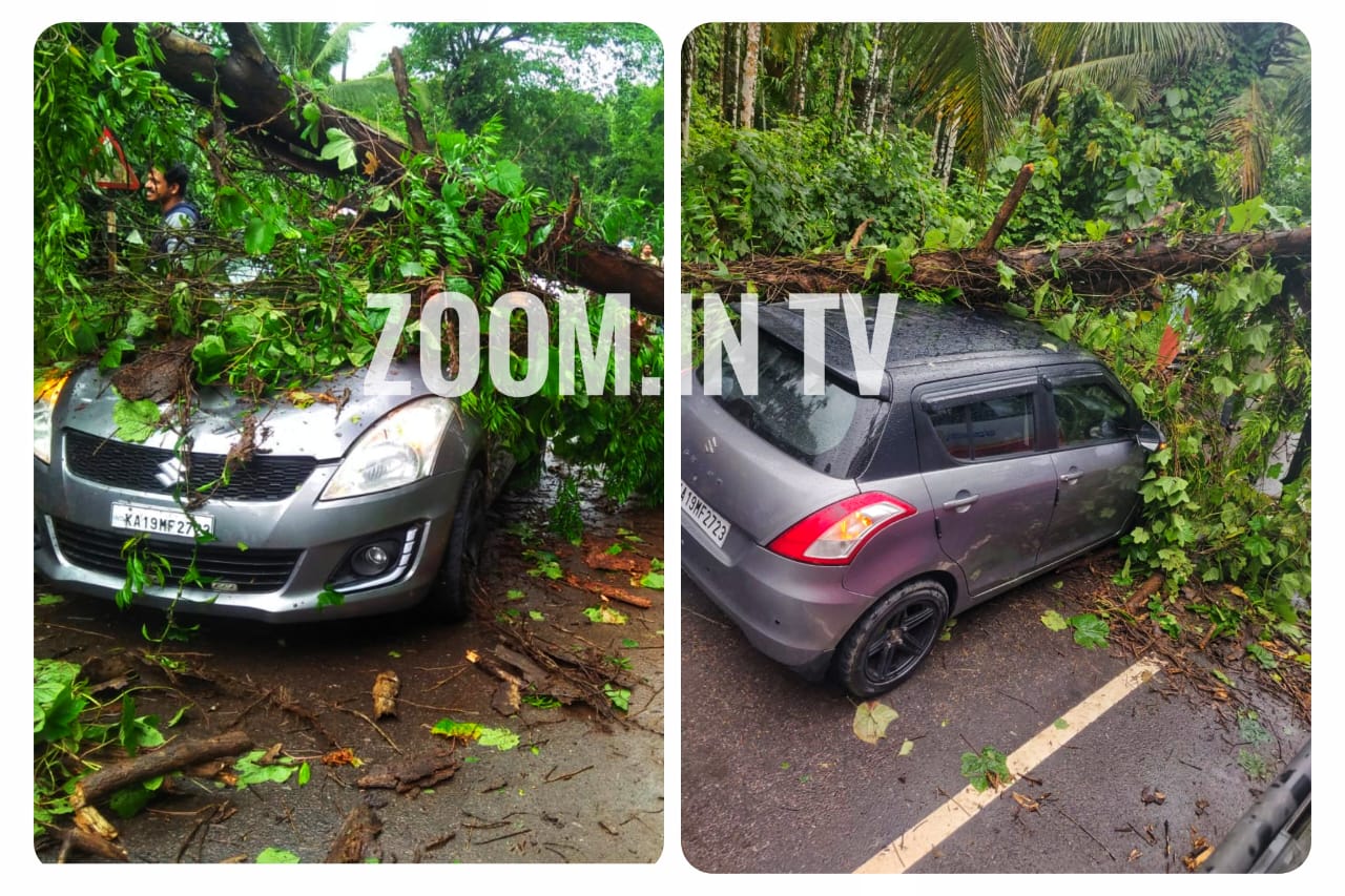 ಜು.13 ರಂದು ಮಧ್ಯಾಹ್ನ ಬೀಸಿದ ಭಾರೀ ಗಾಳಿಗೆ ಚಲಿಸುತ್ತಿದ್ದ ಕಾರಿನ ಮೇಲೆ ಮರವೊಂದು ಮುರಿದು ಬಿದ್ದಿದೆ.