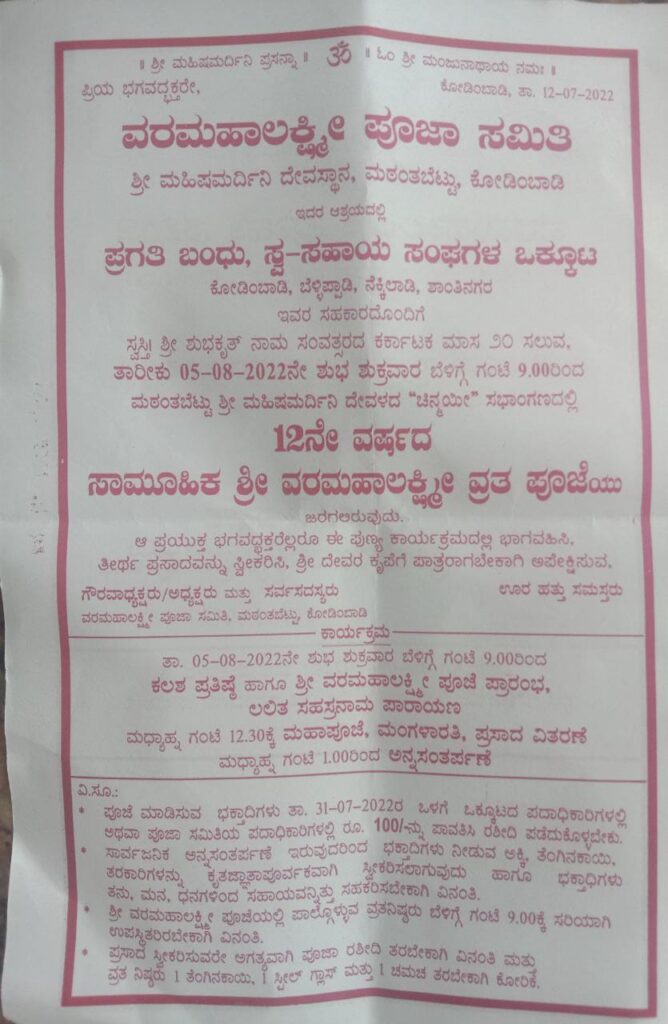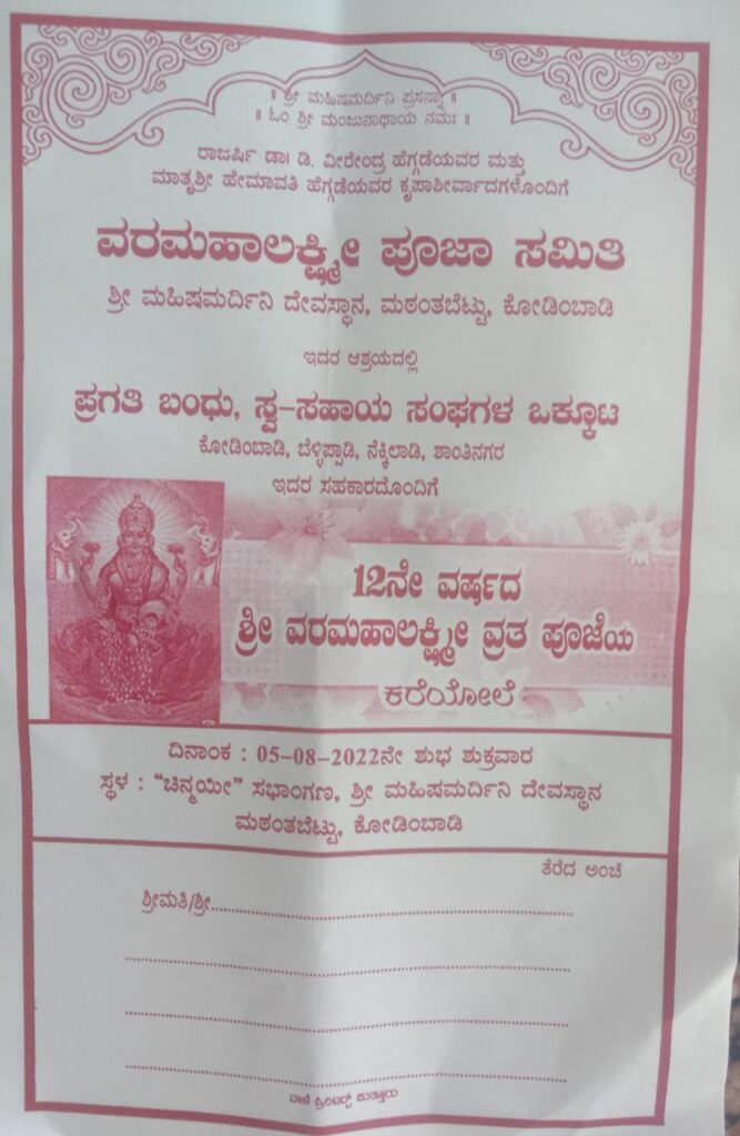 ಪುತ್ತೂರು: ಮಠಂತಬೆಟ್ಟು ಶ್ರೀ ಮಹಿಷಮರ್ದಿನಿ ದೇವಸ್ಥಾನದಲ್ಲಿ ಆ.5 ರಂದು ನಡೆಯಲಿರುವ ‘ವರ ಮಹಾಲಕ್ಷ್ಮಿ ವ್ರತ ಪೂಜೆ’ಯ ಆಮಂತ್ರಣ ಪತ್ರಿಕೆಯನ್ನು ಜು.17 ರಂದು ಬಿಡುಗಡೆಗೊಳಿಸಲಾಯಿತು.