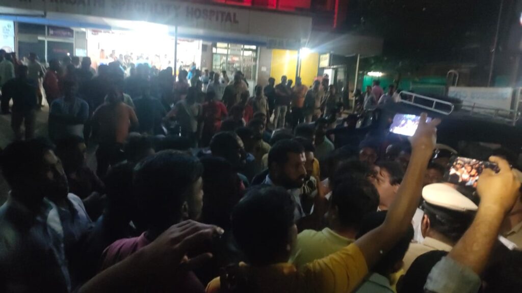 ಪ್ರವೀಣ್ ಹತ್ಯೆಯಾದ ಹಿನ್ನೆಲೆ ಆಸ್ಪತ್ರೆಯ ಮುಂಭಾಗ ಹಿಂದೂ ಸಂಘಟನೆ ಕಾರ್ಯಕರ್ತರು ಧರಣಿ ನಡೆಸುತ್ತಿದ್ದಾರೆ.
