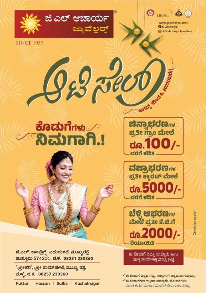 ಪುತ್ತೂರು: ಜಿ.ಎಲ್. ಆಚಾರ್ಯ ಜ್ಯುವೆಲ್ಲರ್ನ ಪುತ್ತೂರು ಹಾಗೂ ಸುಳ್ಯ ಚಿನ್ನಾಭರಣ ಮಳಿಗೆಗಳಲ್ಲಿ ಆಗಸ್ಟ್ 1ರಿಂದ 6ರ ವರೆಗೆ `ಆಟಿ ಸೇಲ್’ ಆಯೋಜಿಸಲಾಗಿದೆ.